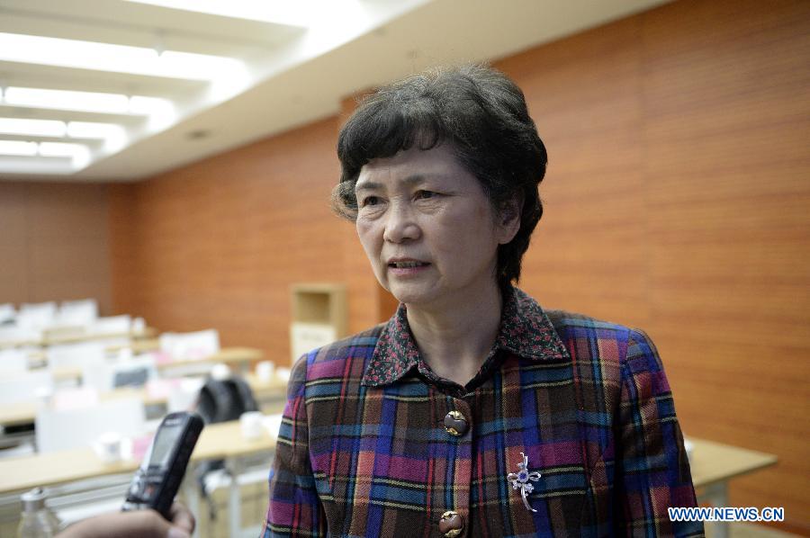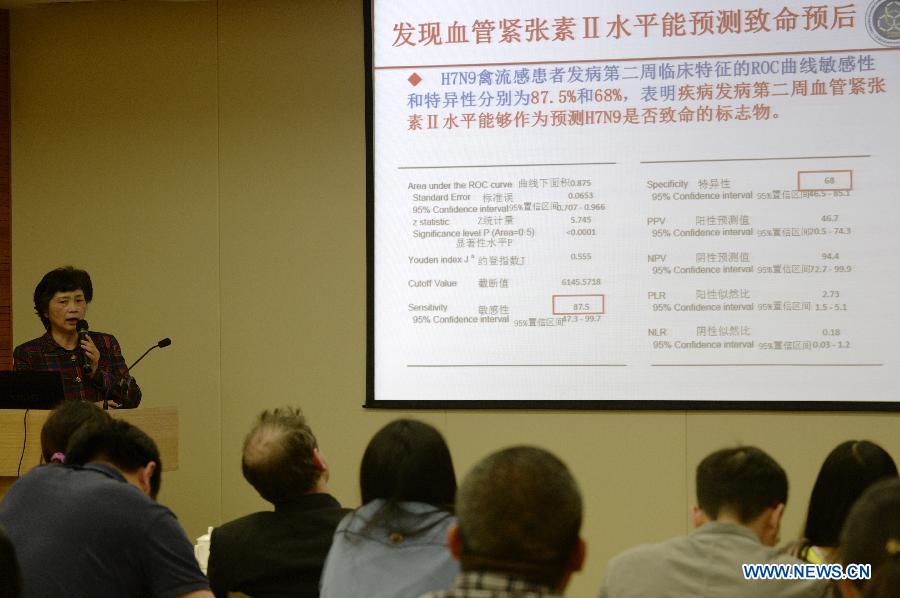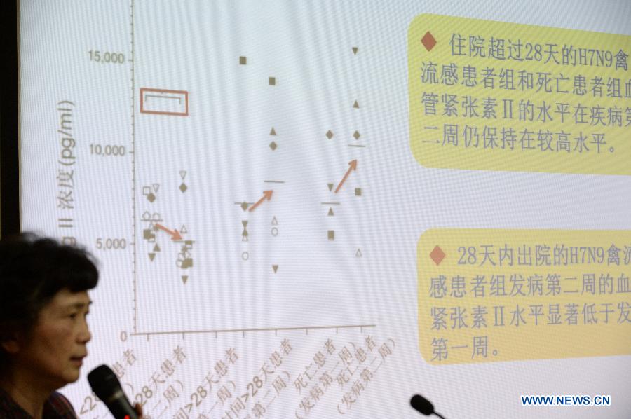 Li Lanjuan, researcher at the Chinese Academy of Engineering and a specialist in H7N9 prevention, receives an interview after a press conference in Hangzhou, capital of east China's Zhejiang Province, May 6, 2014. A human blood protein has been found to be associated with the H7N9 fatality rate, according to a study by Chinese medical scientists. The study, published in Nature Communications on Tuesday, showed that blood plasma levels of angiotensin II are higher in H7N9 patients and could be used to predict their physical deterioration. Angiotensin II is a human protein contained in plasma, the vascular wall, heart and kidney to regulate blood pressure. It is closely linked to acute lung injury. (Xinhua/Ju Huanzong)