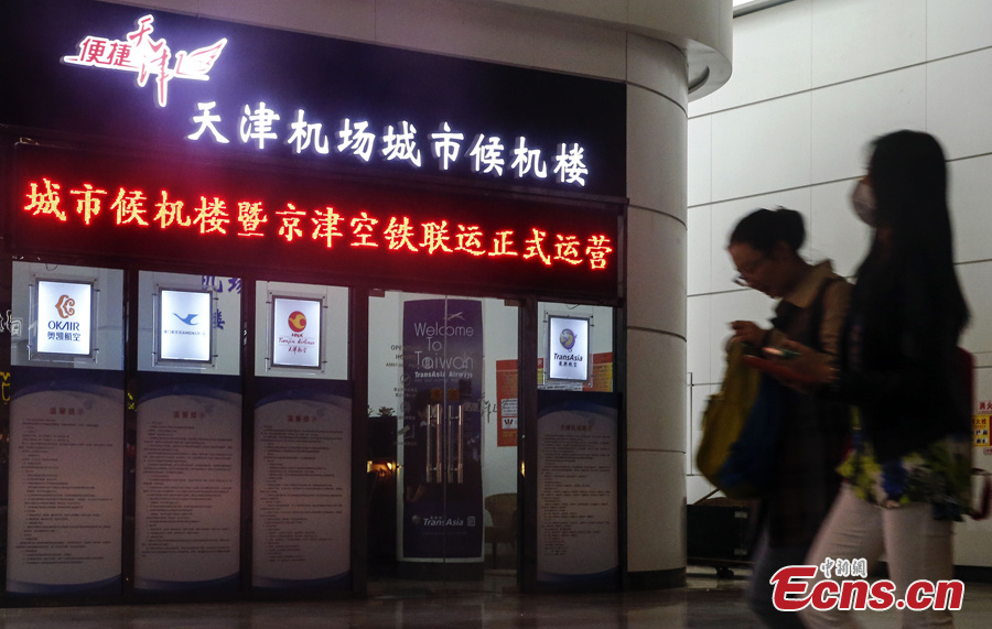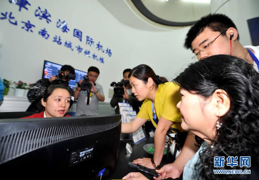 A new terminal at Beijing South Railway Station, built by Tianjin Binhai International Airport, begins operations on May 8, 2014. Passengers are able to buy air tickets and complete check-in procedures at the Beijing station, and then take the 30-minute bullet train to Tianjin Railway Station free of charge. A bus will then carry passengers to the Tianjin Binhai International Airport, also free. (Photo: China News Service/Zhang Hao)