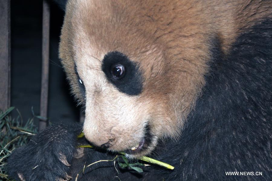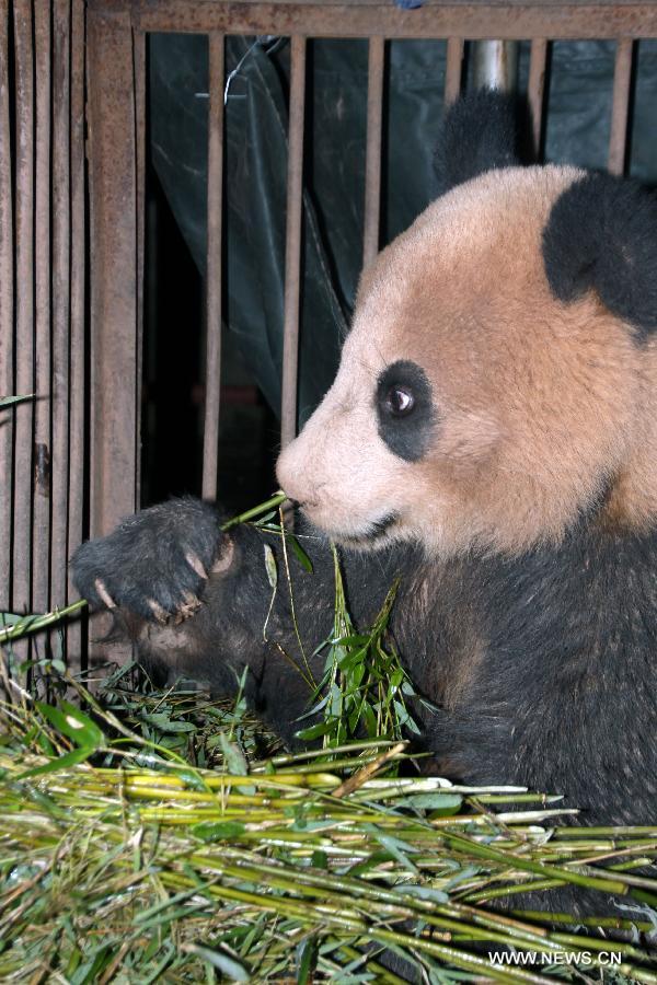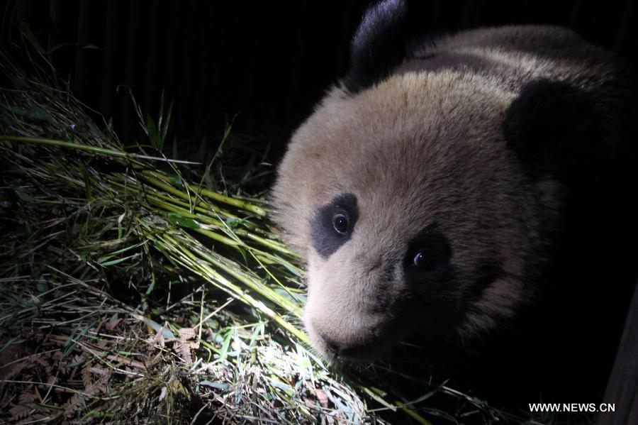 The wild panda eats bamboos at the Dafengding National Nature Reserve in Meigu County, southwest China's Sichuan Province, May 9, 2014. A villager in Yimudi Township of Sichuan discovered the wild panda by a bamboo forest near his house on Wednesday. Due to a lack of bamboos for the panda to eat and risk of poachers, the township government decided to move the animal to neighboring Dafengding National Nature Reserve in Meigu County, 170 km away from the town. (Xinhua)