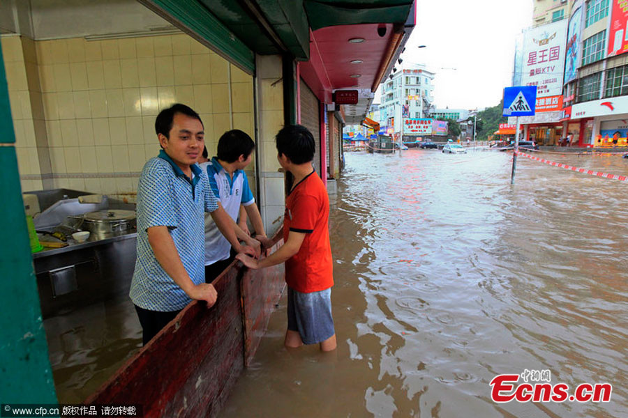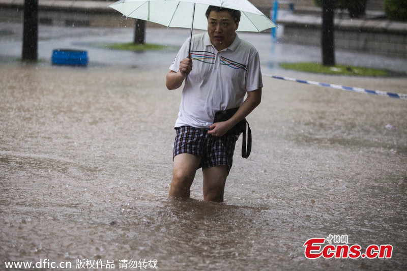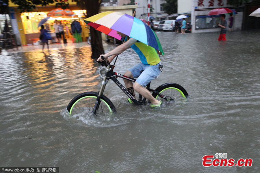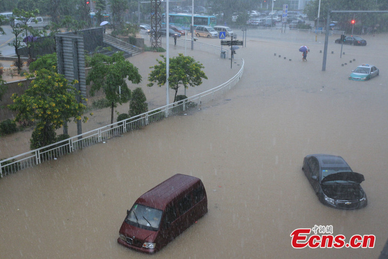 Shenzhen city in south China's Guangdong Province experiences its strongest rainfall since 2008 on Sunday, May 11, 2014, with 2,000 cars submerged in the streets and the operations of more than 5,000 buses suspended. The city's meteorological bureau issued a red alert for heavy rain, the highest level of the four-tier alert system. About 130 flights have been canceled at the Shenzhen airport, while another 70 outbound flights have been delayed for more than four hours as of 7:30 p.m. on Sunday evening. [Photo/CFP]
