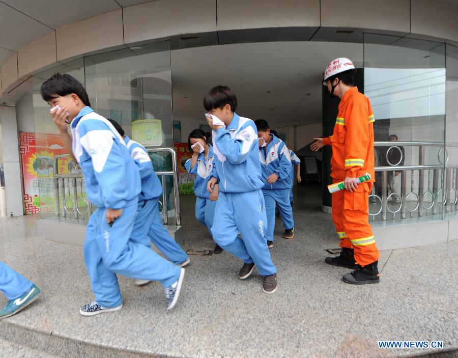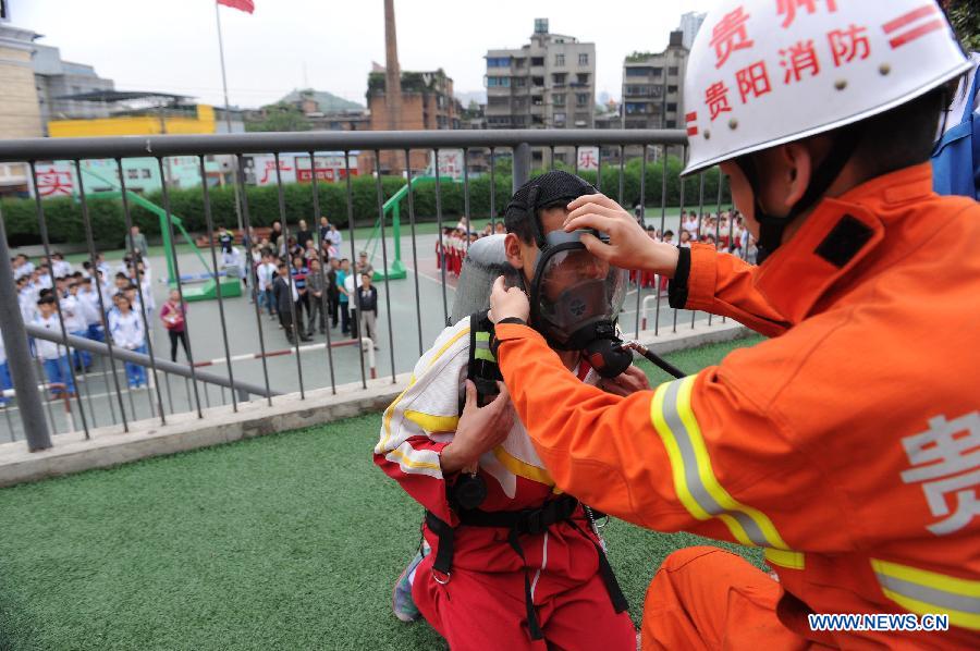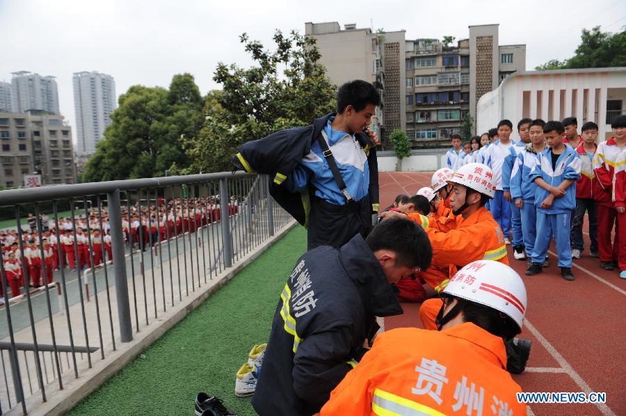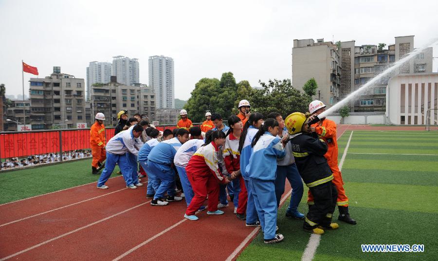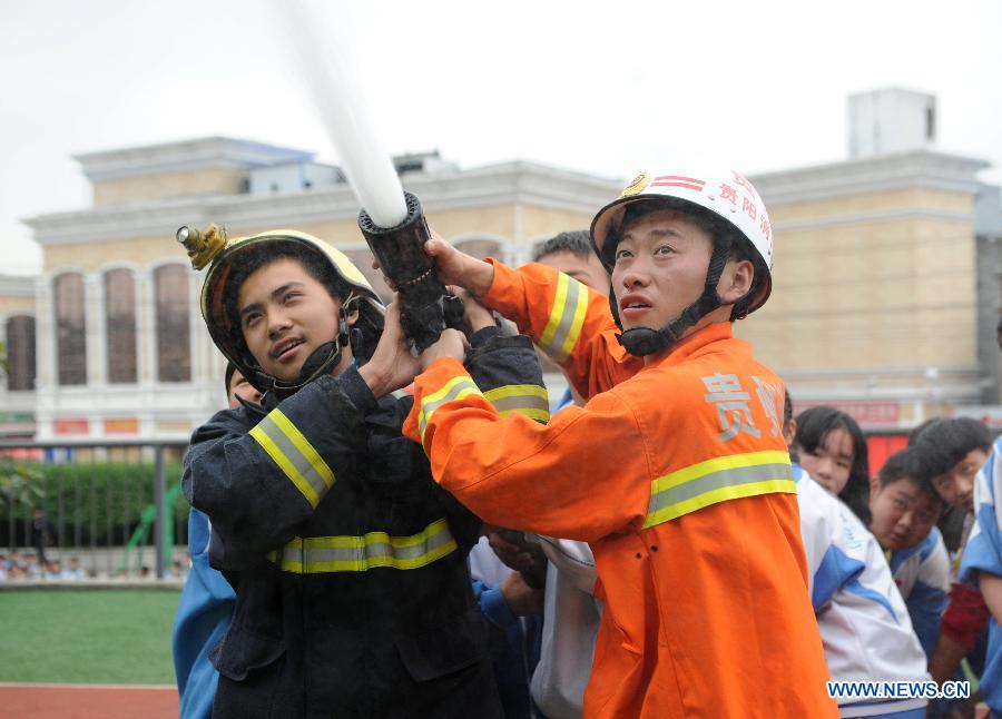 Students learn usingwater cannons with the guidance of firefighters at No. 29 Middle School in Guiyang, capital of southwest China's Guizhou Province,May 12, 2014. Monday marks China's sixth National Disaster Prevention and Reduction Day. Schools across China conduct disaster prevention drills on this special occasion. (Xinhua/Tao Liang)