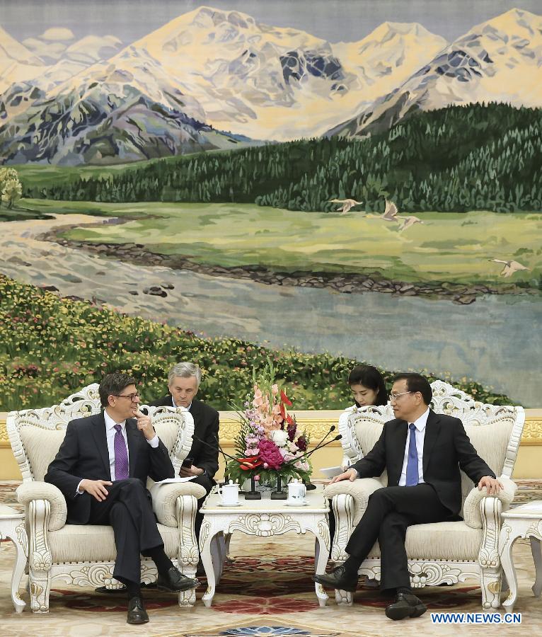 Chinese Premier Li Keqiang (R) meets with U.S. President Barack Obama's special representative and Treasury Secretary Jacob Lew in Beijing, capital of China, May 13, 2014. (Xinhua/Pang Xinglei)