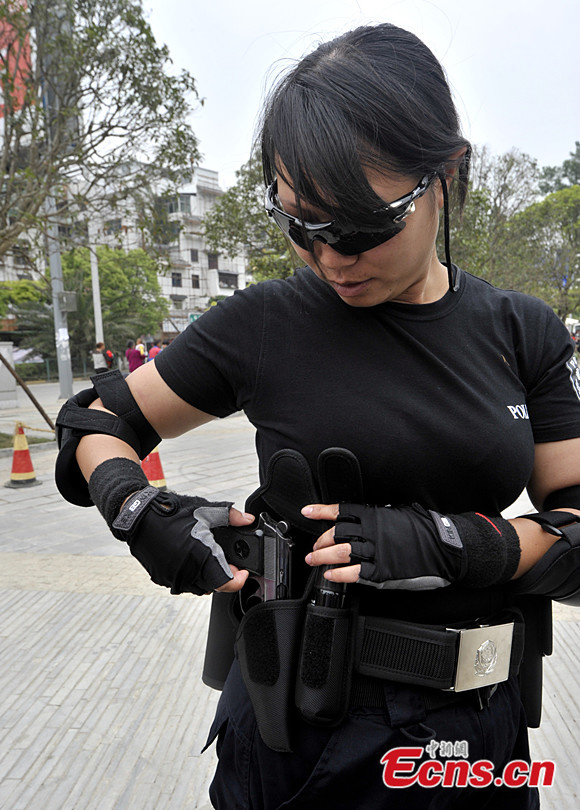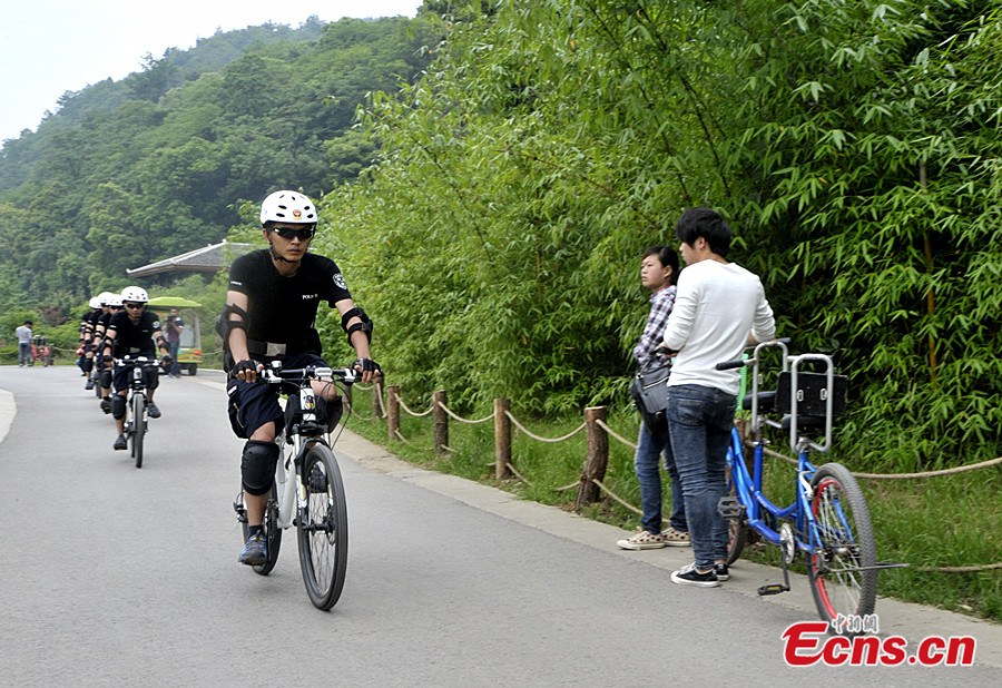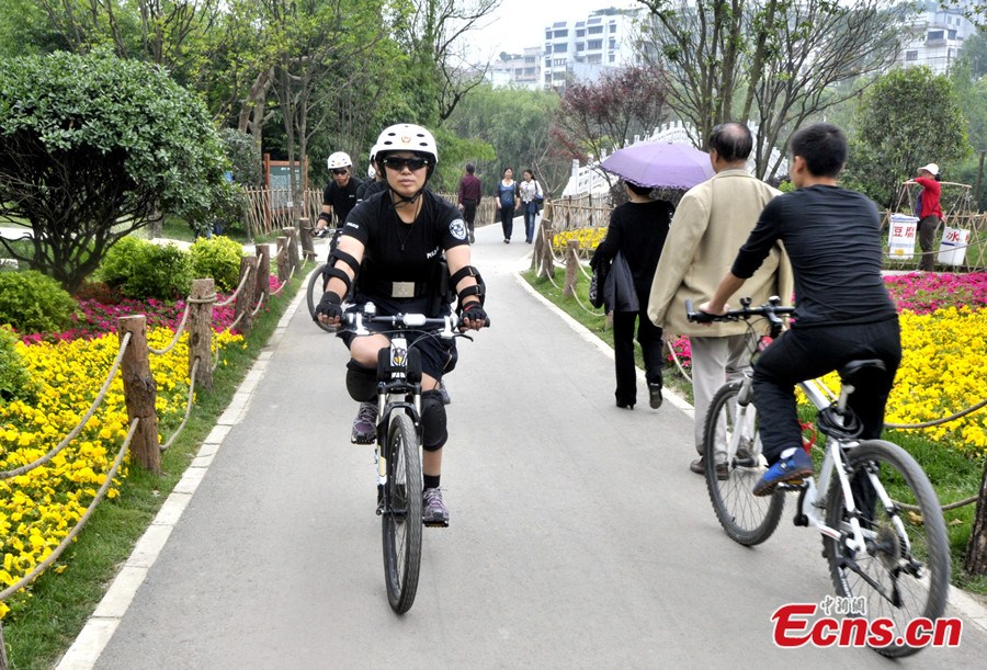Armed police officers patrol at Huaxi National Wetland Park in Guiyang of southwest China's Guizhou province on May 14, 2014. The local public security bureau established a bicycle patrol team with 40 members, who mainly patrol in parks and scenic areas. The patrol officers are all equipped with pistols for live fire. [Photo: China News Service / Yang Guangzhen]