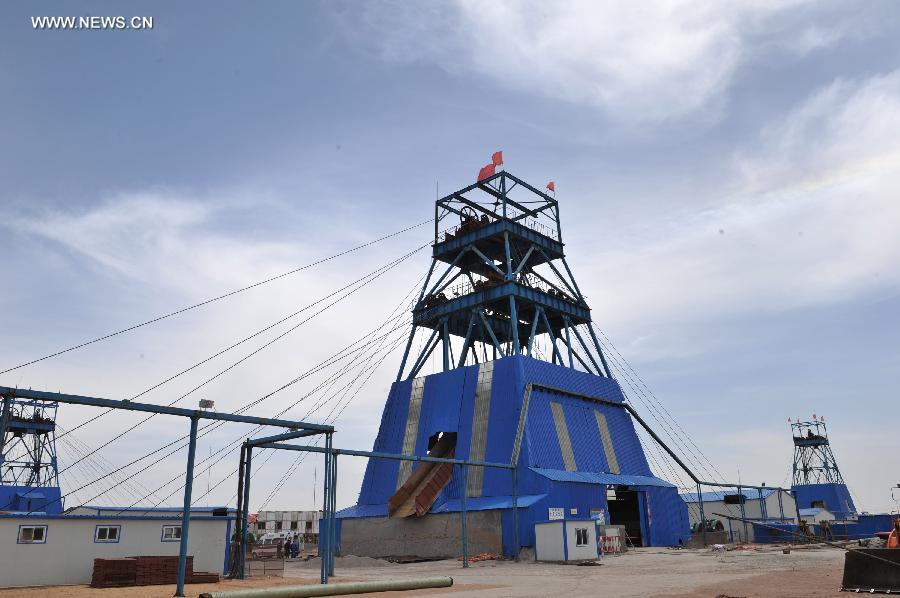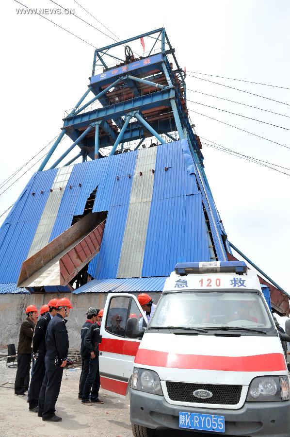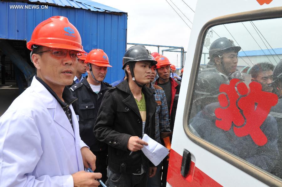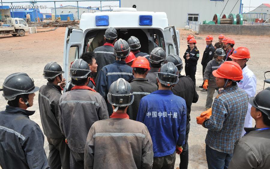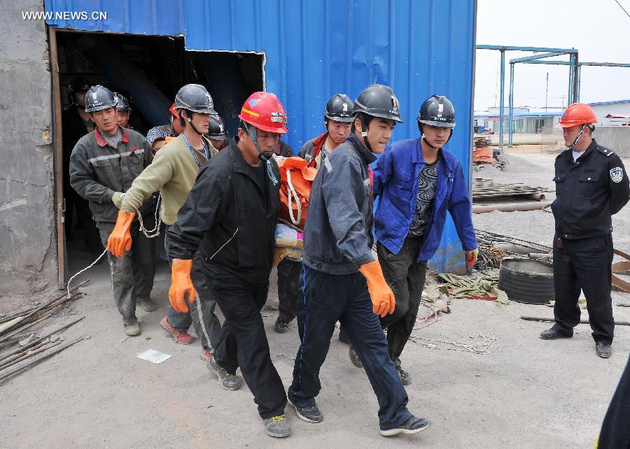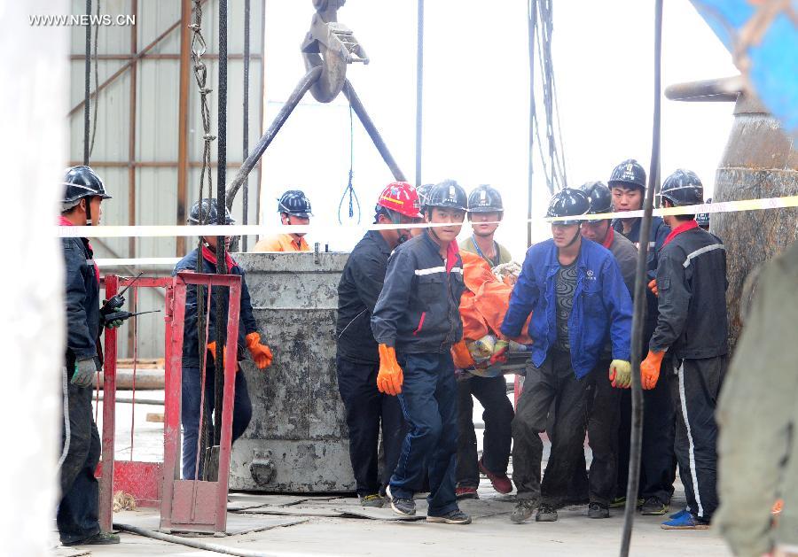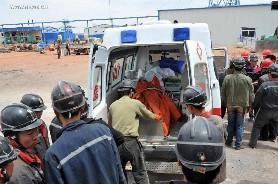 Rescuers carry the body of a victim at the Dahaize coal mine under construction by China National Coal Group Corp in Yulin City, northwest China's Shaanxi province, May 15, 2014. Death toll in an accident in the Dahaize coal mine on Wednesday has risen to seven, and rescue of six trapped workers is under way, local authorities said Thursday. (Xinhua/Ding Haitao)