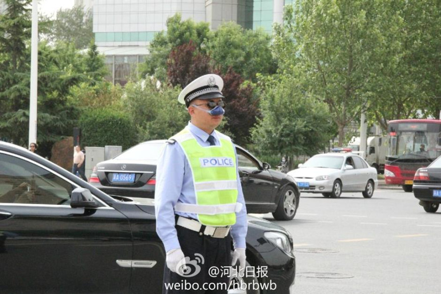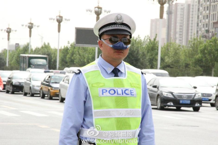A traffic police, wearing an anti-smog nasal air filter, is on duty in Shijiazhuang of Hebei province. [Photo/ Weibo account of Hebei Daily]
