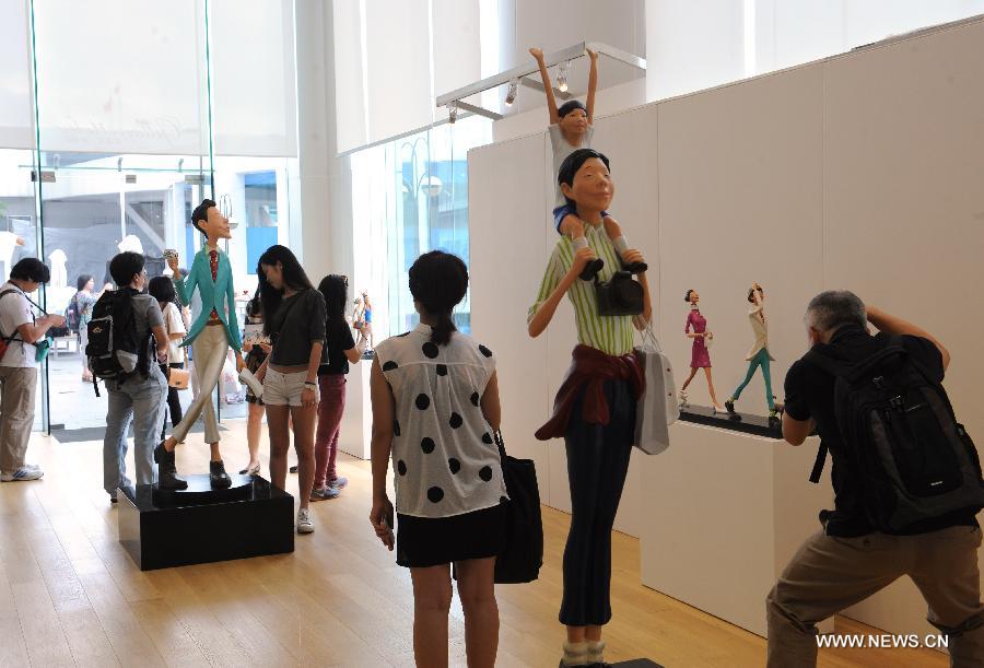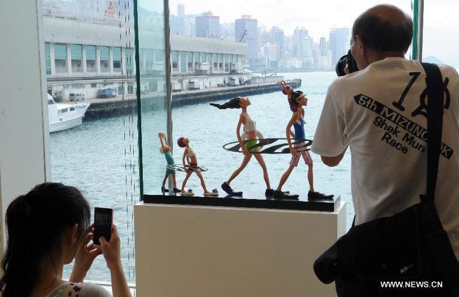 People look at sculptures at "Happy Moments" sculpture exhibition in Hong Kong, south China, May 15, 2014. The art exhibition of Korean sculptor Kim Gyung-Min would open from May 15 to June 2. (Xinhua/Wong Pun Keung)
