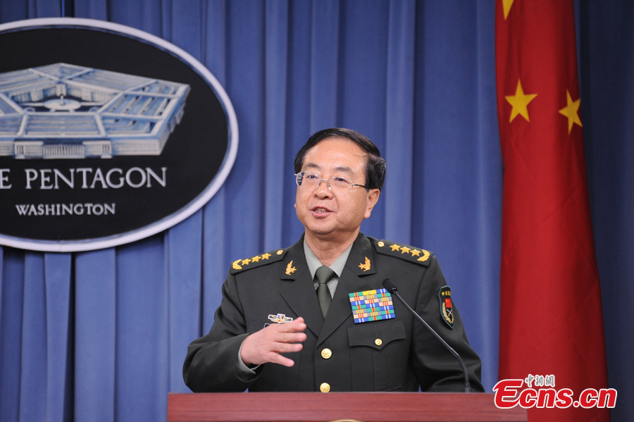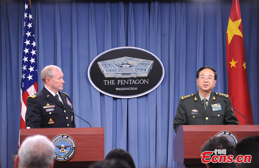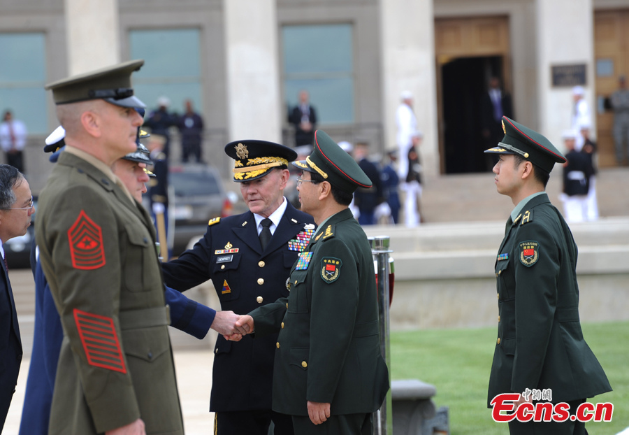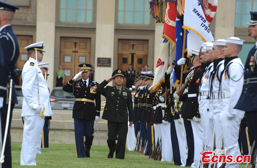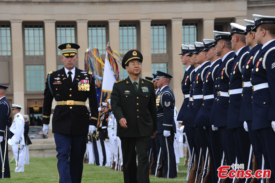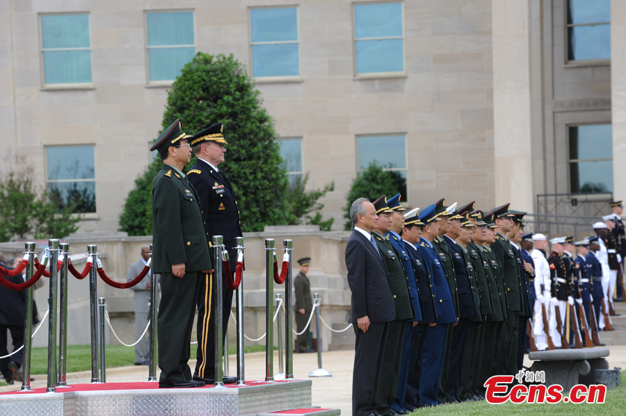 Fang Fenghui, chief of the General Staff of China's People's Liberation Army (PLA), receives a full-military-honors arrival ceremony at the Pentagon in Washington, US, May 15, 2014. Fang is paying a five-day visit to the US at the invitation of Martin Dempsey, chairman of the US Joint Chiefs of Staff. (Photo: China News Service/Zhang Weiran)