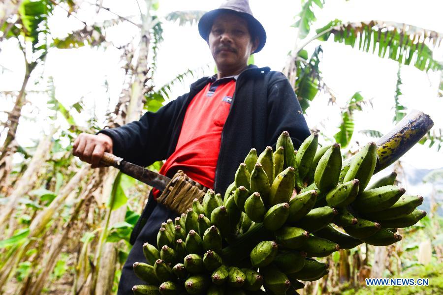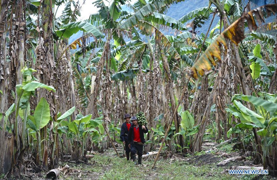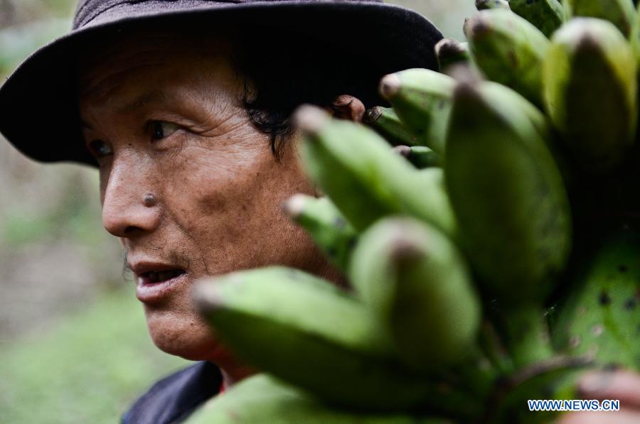 A farmer of the Menba ethnic group works at a banana plantation in Medog County, southwest China's Tibet Autonomous Region, May 10, 2014. Medog, the last county in China to gain road access to the outside world, has about 153 hectares of banana trees and plans to expand the acreage to over 670 hectares in the future. (Xinhua/Purbu Zhaxi)