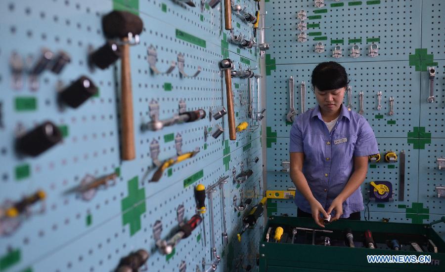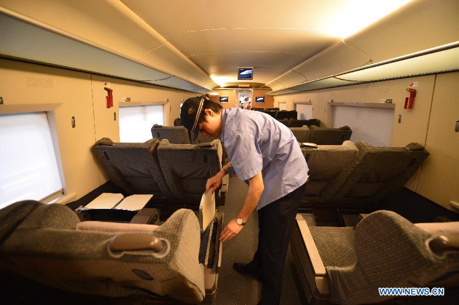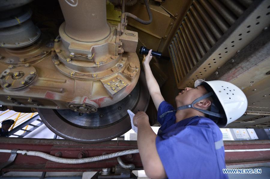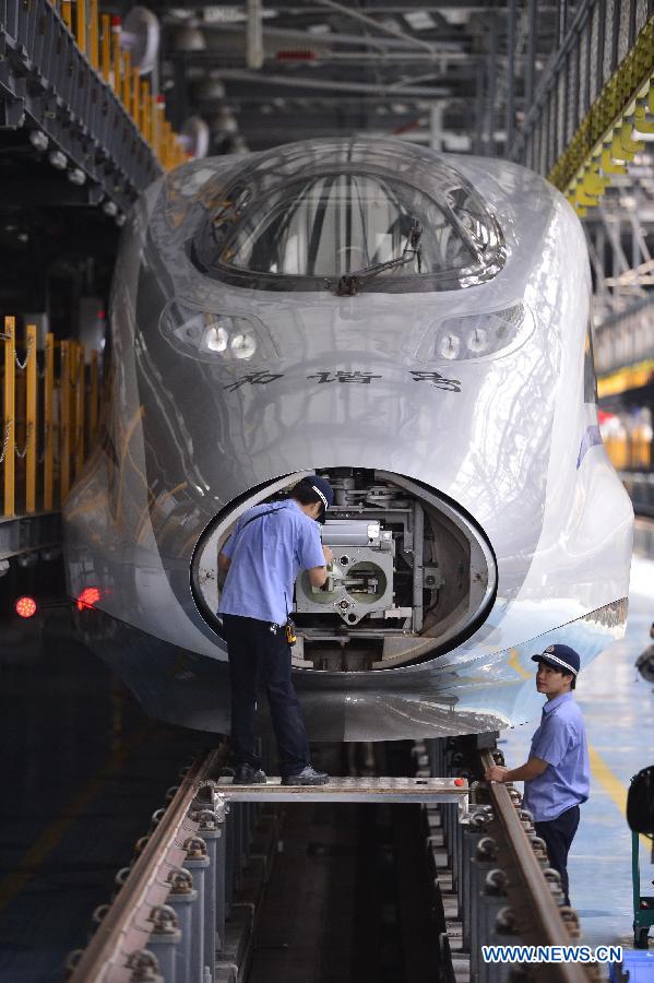 A technician examines the bullet train CRH 380A in Nanchang, capital of east China's Jiangxi Province, May 15, 2014. The Hangzhou-Nanchang-Changsha High Speed Railway will open to traffic this September. Two CRH 380A will be put into service on this route. (Xinhua/Zhou Mi)