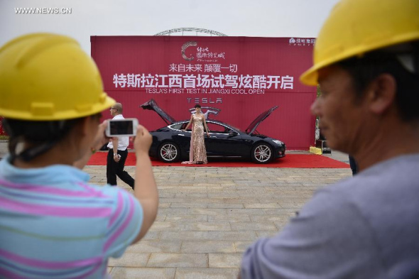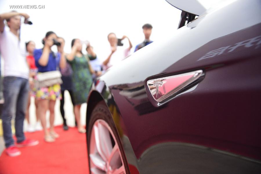 Photo taken on May 17, 2014 shows a Tesla Model S electronic car at an activity in Nanchang, capital of east China's Jiangxi Province. Model S made its debut in Nanchang between Friday and Saturday. (Xinhua/Zhou Mi)