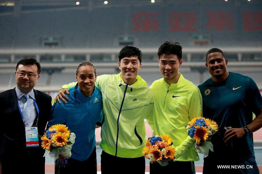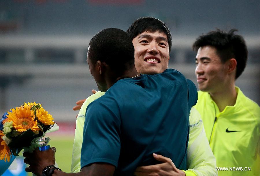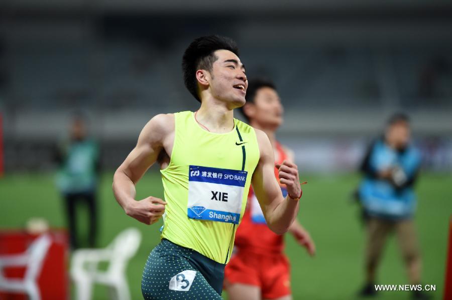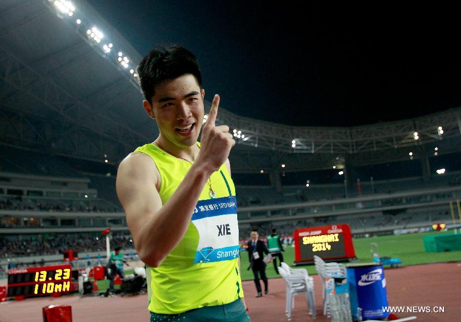China's Xie Wenjun corsses the finish line during the men's 110m hurdles race at the IAAF Diamond League Athletics in Shanghai, east China, May 18, 2014. (Xinhua/Li Jundong)