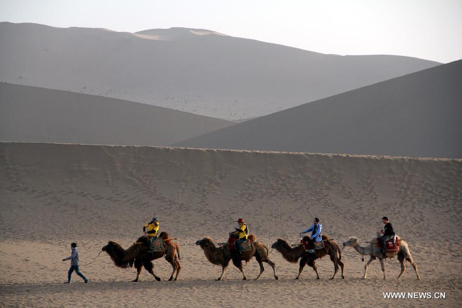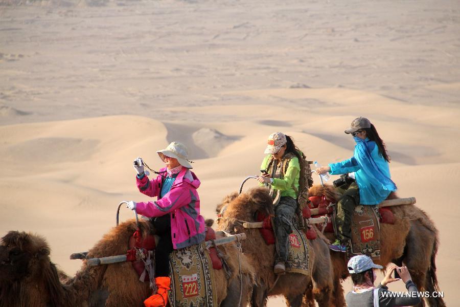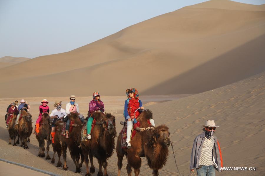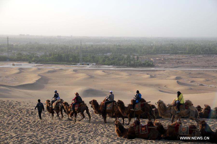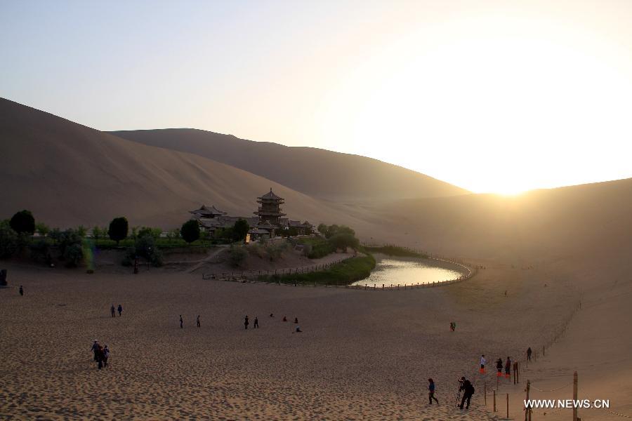 Tourists visit the Mingshashan (literally "singing-sand mountain") and Crescent Lake, an oasis scenic spot in the Gobi Desert in Dunhuang, northwest China's Gansu Province, May 18, 2014. (Xinhua/Zhang Xiaoliang)