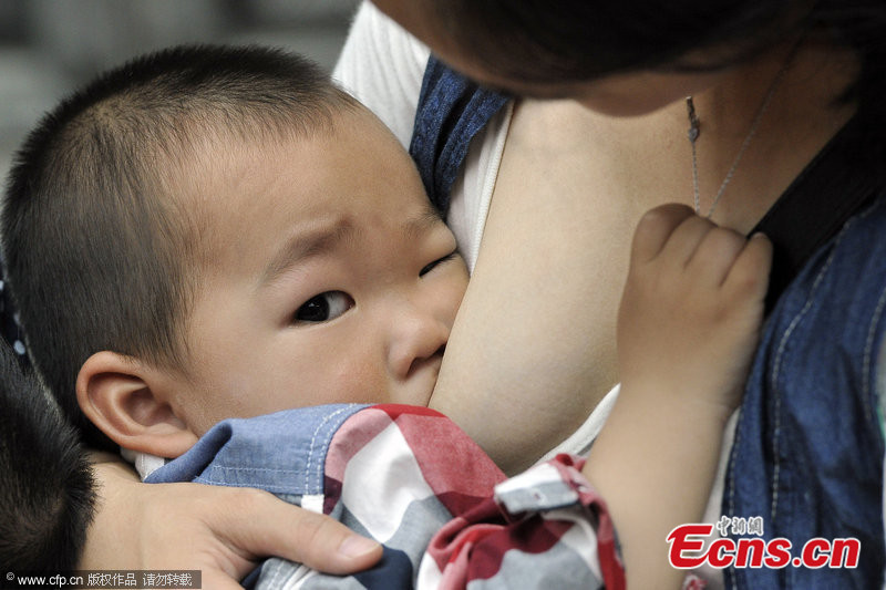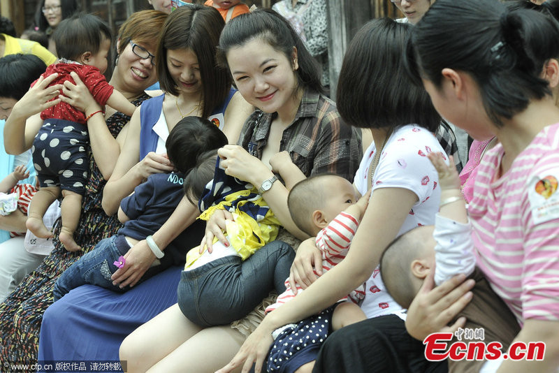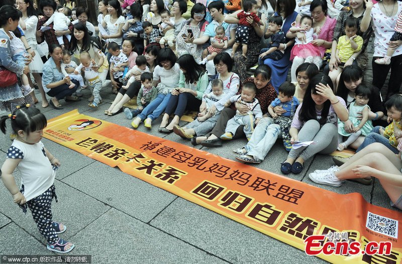 This photo taken on May 17 in Fuzhou, Fujian province, shows women breastfeeding their babies in public, as part of an activity marking National Day of Breastfeeding - which falls on May 20 every year. This activity involved over 30 women who aimed to increase awareness of the benefits of breastfeeding for both baby and mother. [Photo/CFP]