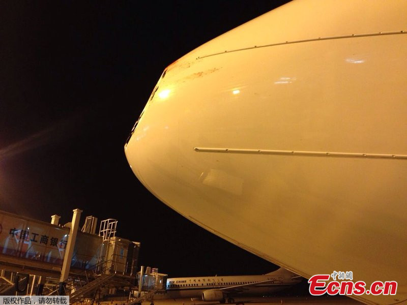 A Hainan Airlines aircraft from Taiyuan to Xiamen collided with a bird in high altitude on May 16, 2014. No casualties were caused but the bird left a giant dent in the nose of the aircraft. [Photo/CFP]