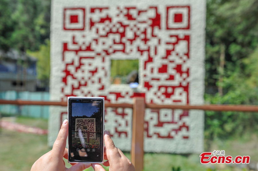 Photo taken on May 19, 2014 shows giant panda Sijia and over 20,000 flowers form a giant Quick Response Code (QR Code) at Yunnan Safari Park in southwest China's Yunnan province. Visitor can sweep the code to get messages and information about the safari park. [Photo: China News Service / Liu Ranyang]