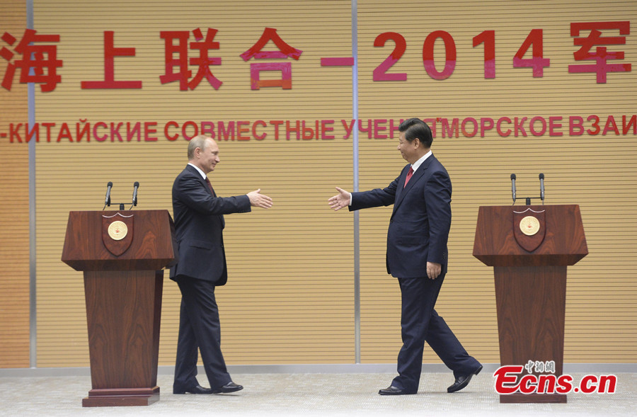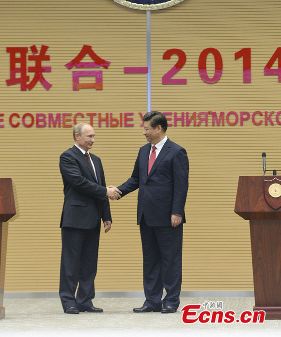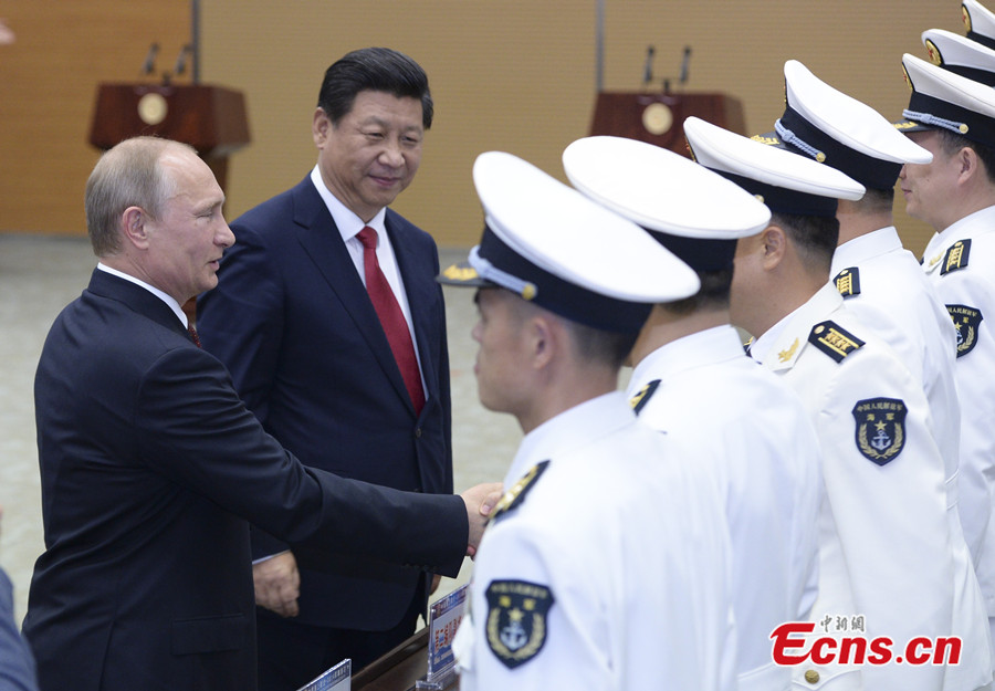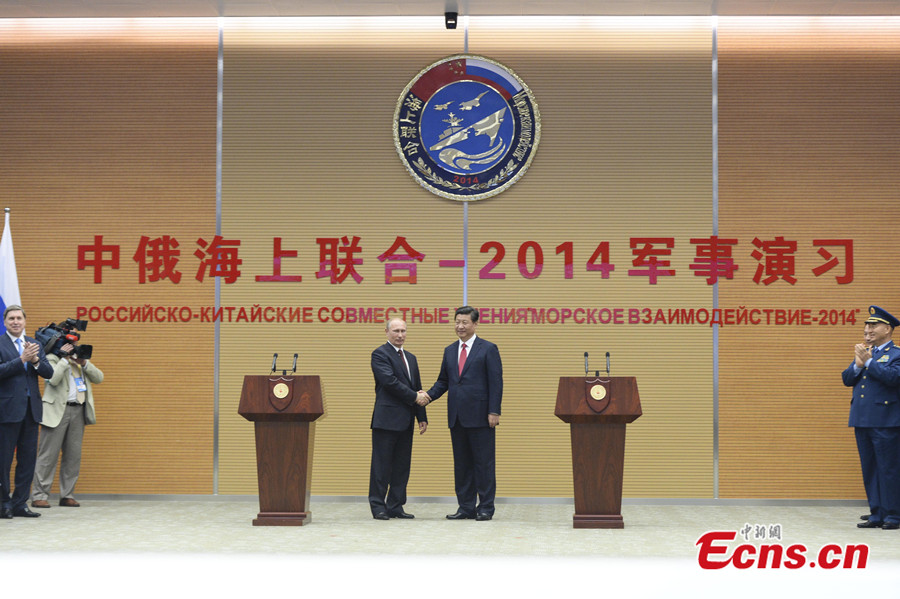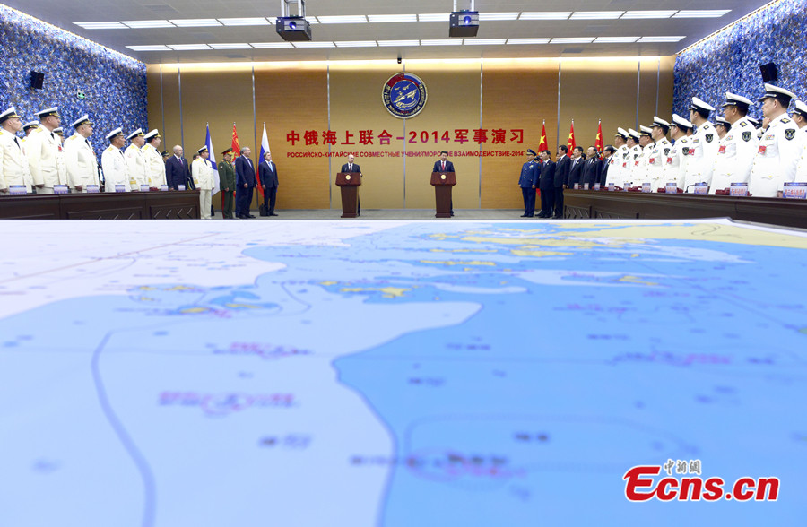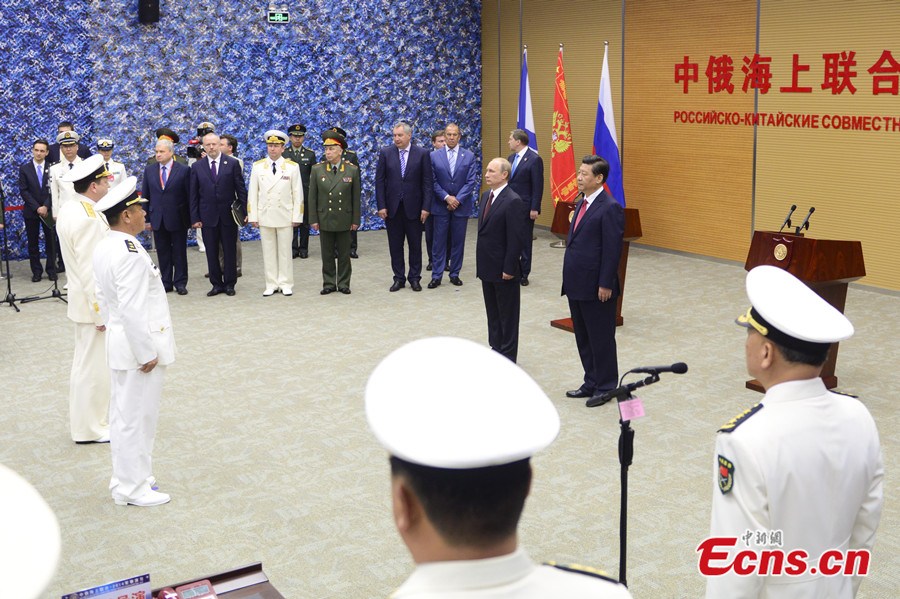 Chinese President Xi Jinping (L2) and his Russian counterpart Vladimir Putin (L1) attend the launch ceremony of the China-Russia "Joint Sea-2014" exercise at Wusong naval port in Shanghai, east China, May 20, 2014. [Photo: China News Service / Liao Pan]