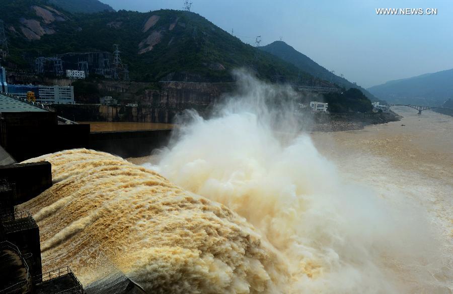 Water gushes from gates of Shuikou Hydropower Station in Minqing County, southeast China's Fujian province, May 21, 2014. The persisting rainstorm pushed up water level here and the hydropower station had to released flood water. (Xinhua/Wei Peiquan)