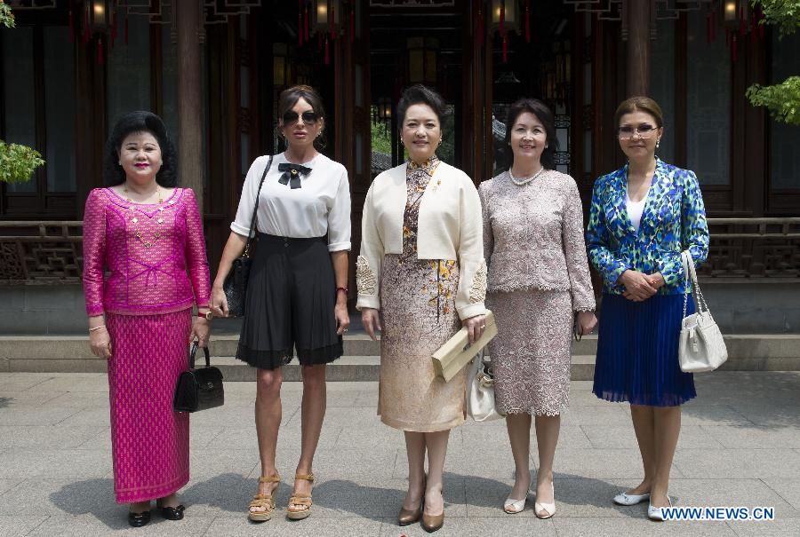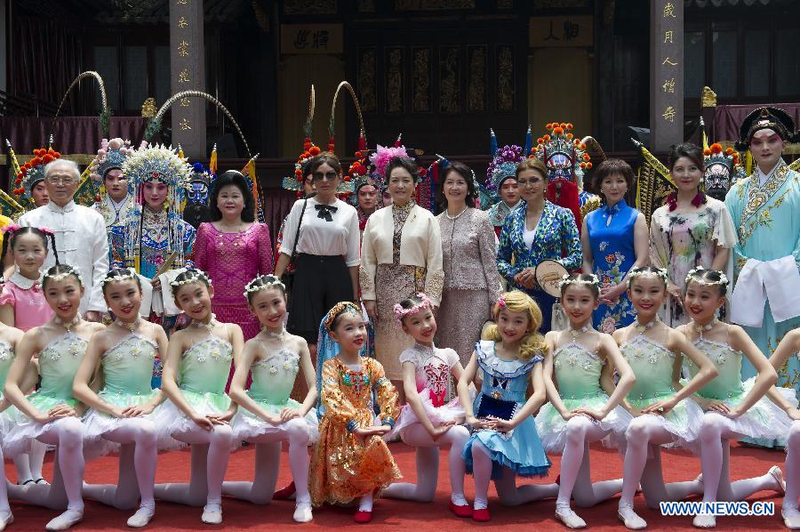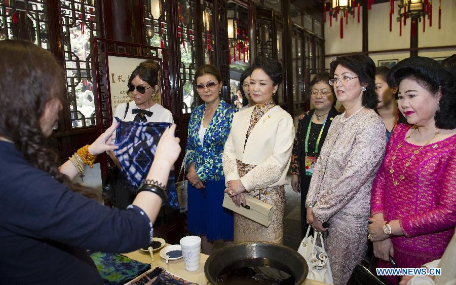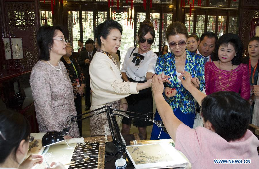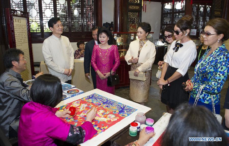 Peng Liyuan (2nd L,front), wife of Chinese President Xi Jinping, Bun Rany (R, front), wife of Cambodian Prime Minister Hun Sen, Mehriban Aliyeva (3rd R,front), wife of Azerbaijan's president Ilham Aliyev, Raisa Atambayeva (L, front), wife of Kyrgyz President Almazbek Atambayev and Dargia Nazarbayeva (2nd R, front), daughter of Kazakhstan's President Nursultan Nazarbayev, watch Su Huiping, a successor ofChinese non-material cultural heritage Gu Embroidery, demonstrating the craft of Gu Embroidery in Shanghai, May 21, 2014. The fourth summit of the Conference on Interaction and Confidence Building Measures in Asia (CICA) opened in Shanghai on Wednesday.(Xinhua/Huang Jingwen)