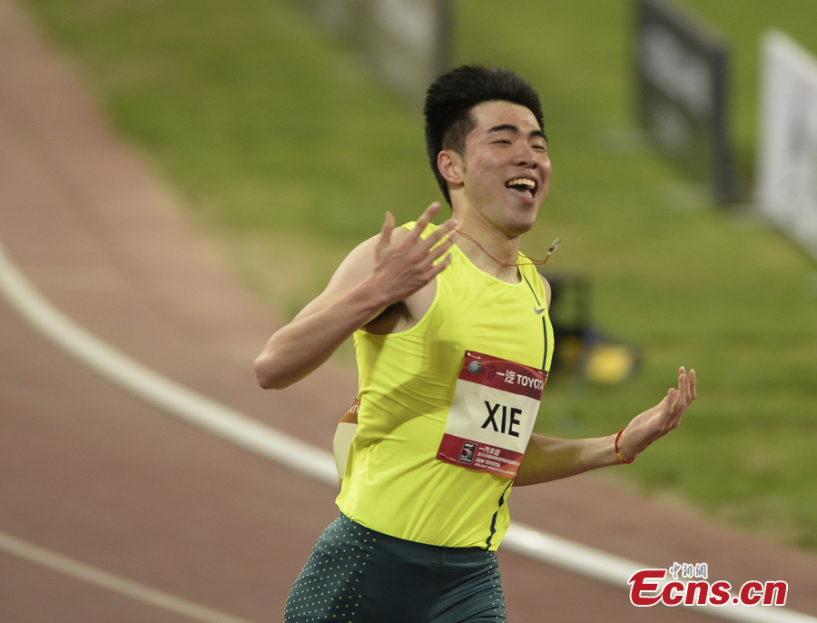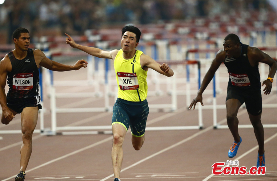China's Xie Wenjun (center) sprints to win the men's 110m hurdles in the 2014 IAAF World Challenge Beijing meet at the National Stadium in Beijing on Wednesday, May 21, 2014. (Photo: China News Service/Zhang Hao)