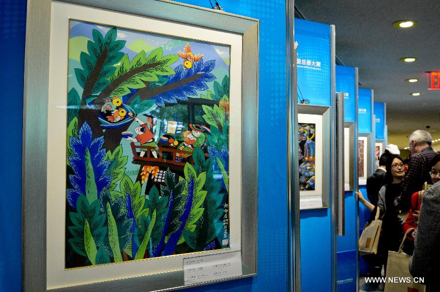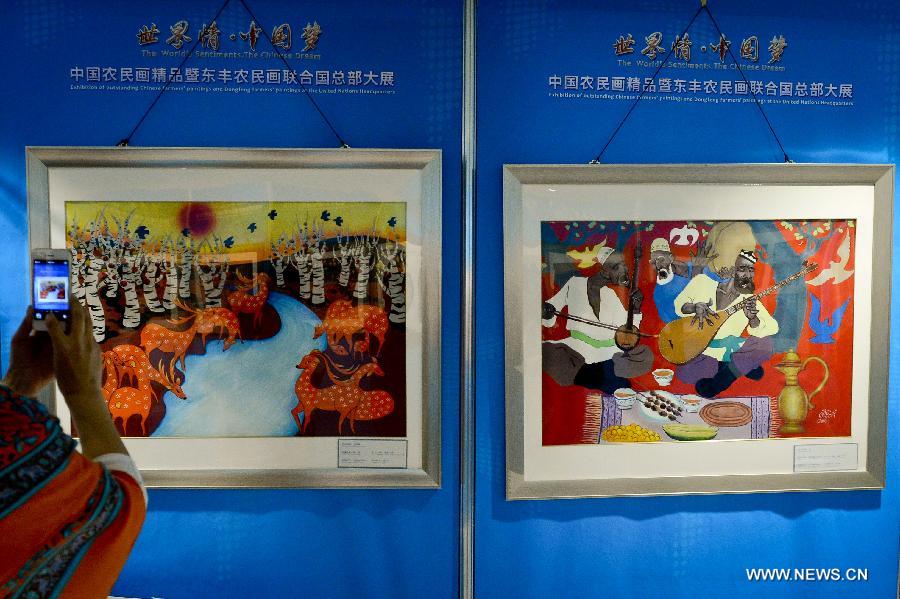 Visitors look at paintings on display during an exhibition of Chinese farmers' paintings, at the UN headquarters in New York, on May 21, 2014. (Xinhua/Niu Xiaolei)