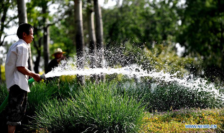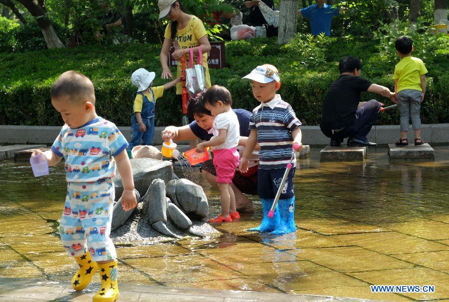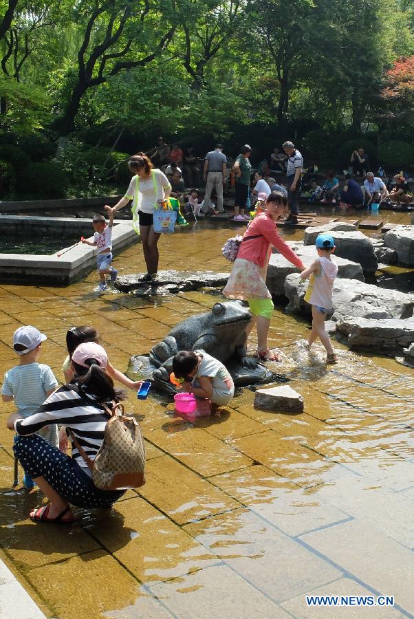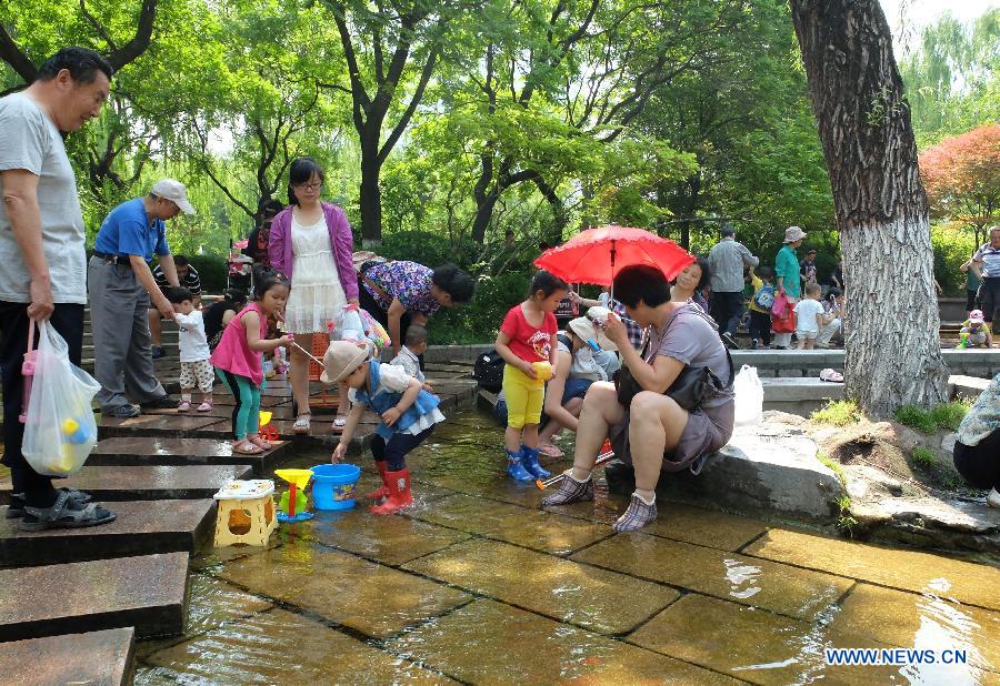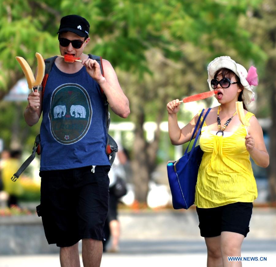 Tourists eat icecream to relieve summer heat at Chang'an Avenue in Beijing, capital of China, May 22, 2014. The highest temperature reached 35.3 degrees Celsius in Beijing on Thursday. (Xinhua/Luo Xiaoguang)