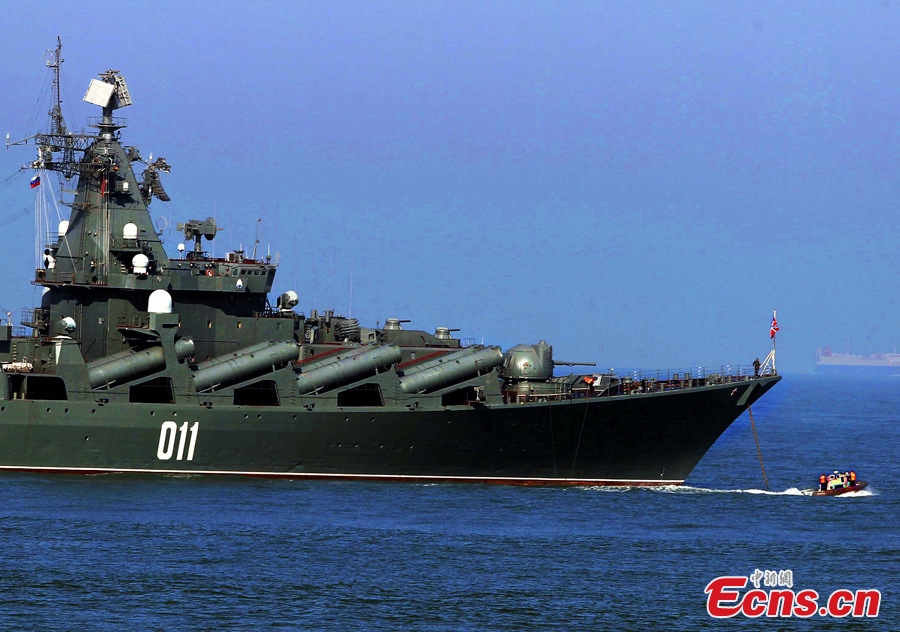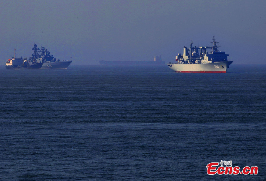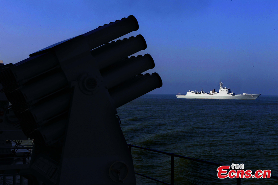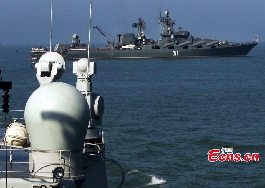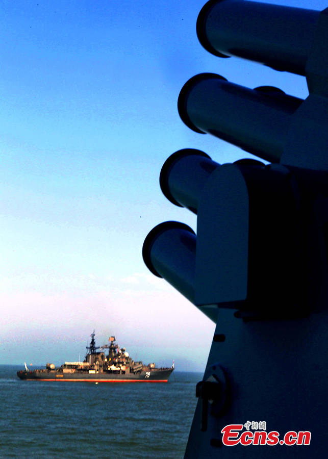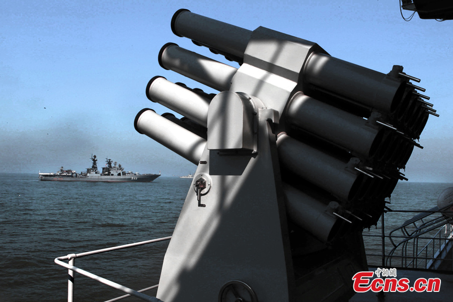 Chinese and Russian navies conduct an anchorage defense exercise in the East China Sea on Thursday, May 22, 2014. It is part of the ongoing naval drill "Joint Sea-2014". The navies will also train their capabilities in maritime assaults, anti-submarine combats, air defense as well as identification, rescue and escort missions in the following days. (Photo: China News Service/Song Jihe)