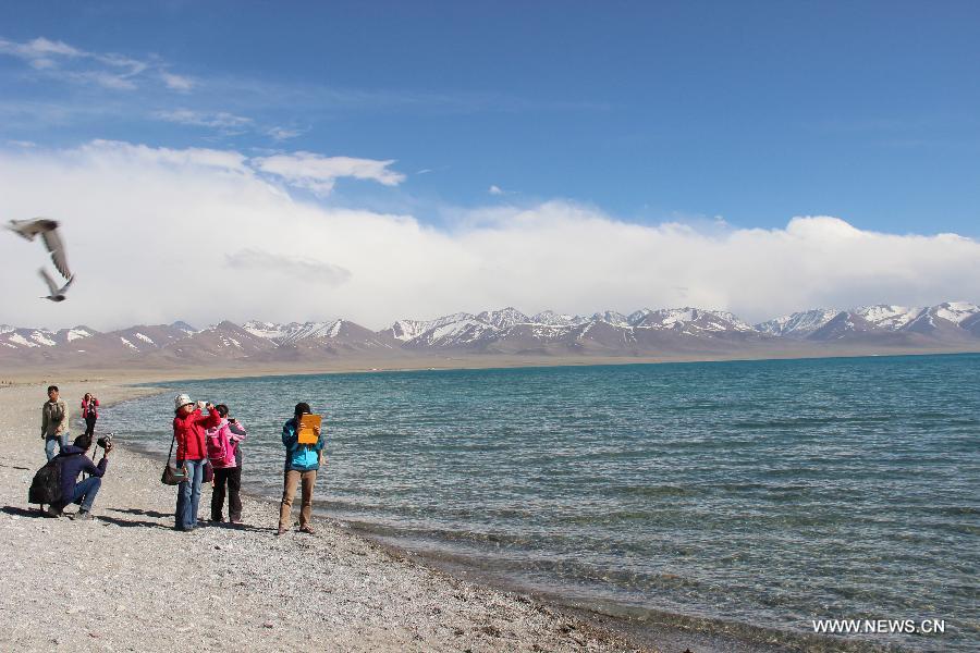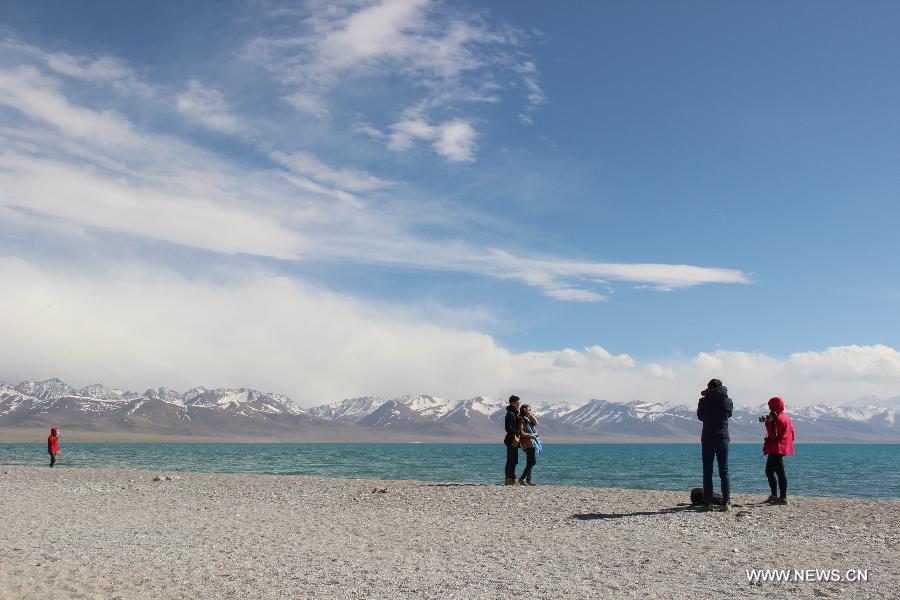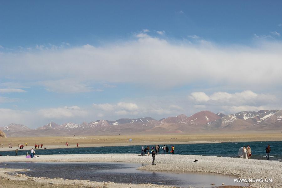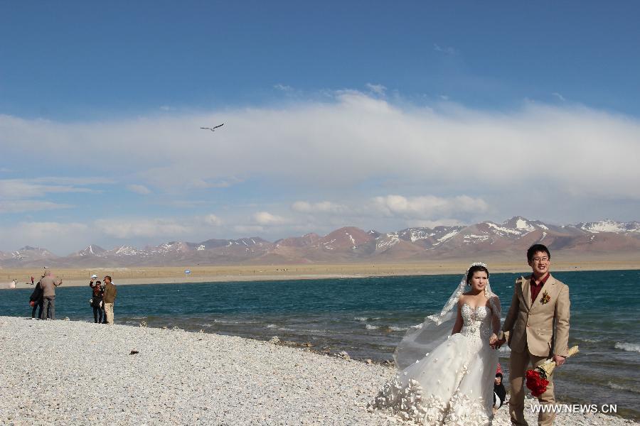 A newlyweds pose for wedding photos on the bank of the Namsto or Lake Nam in Damxung County, southwest China's Tibet Autonomous Region, May 24, 2014. The Namsto Lake, world's highest saltwater lake, has entered into a peak tourism season. (Xinhua/Liu Hongming)