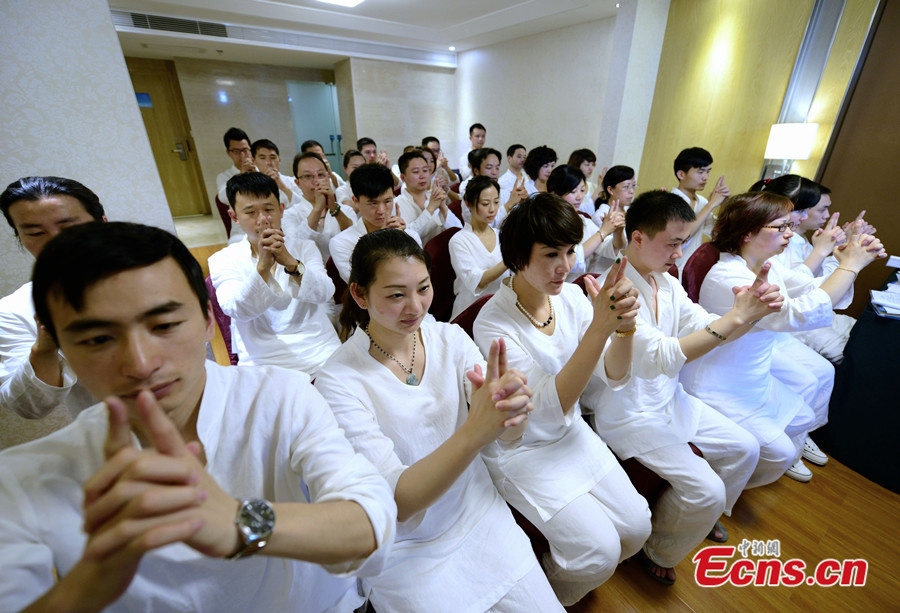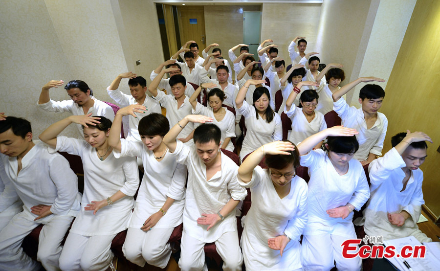A training class to help trainees sleep better opens in Changsha of central China's Hunan province on May 26, 2014. Run by a man named Tang Tang, it's the first one of its kind in Changsha. According to Tang, the trainees are all white-collar workers and his trainings help them release pressure and achieve deep sleep through exercises, self-relaxation and listening to music. [Photo: China News Service / Yang Huafeng]