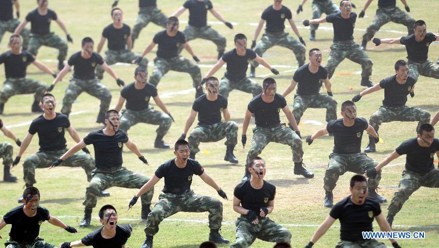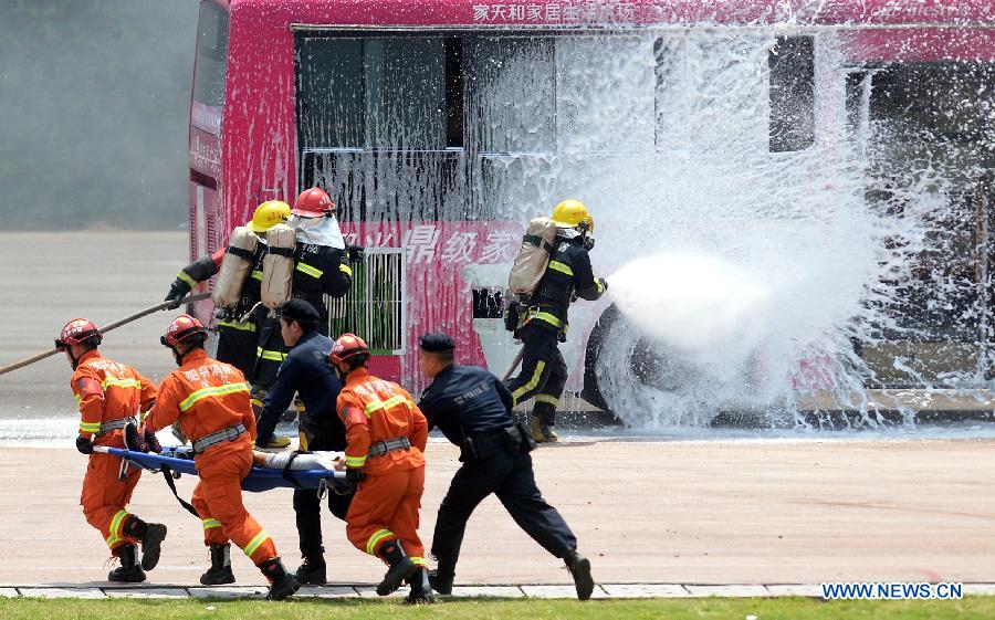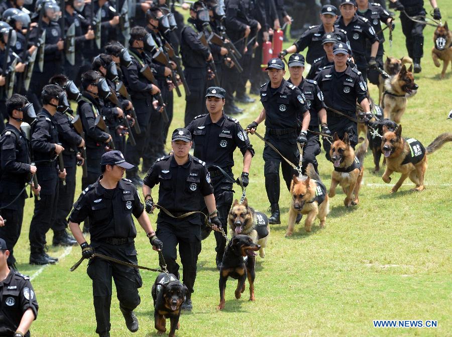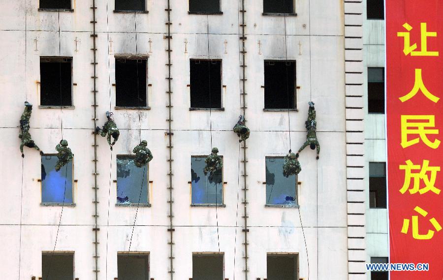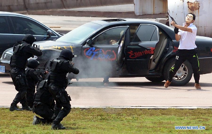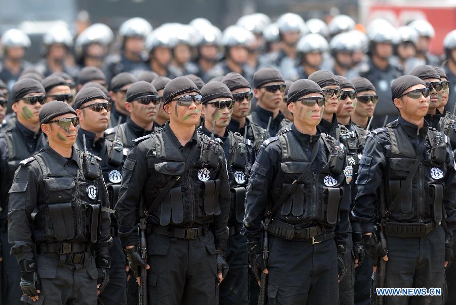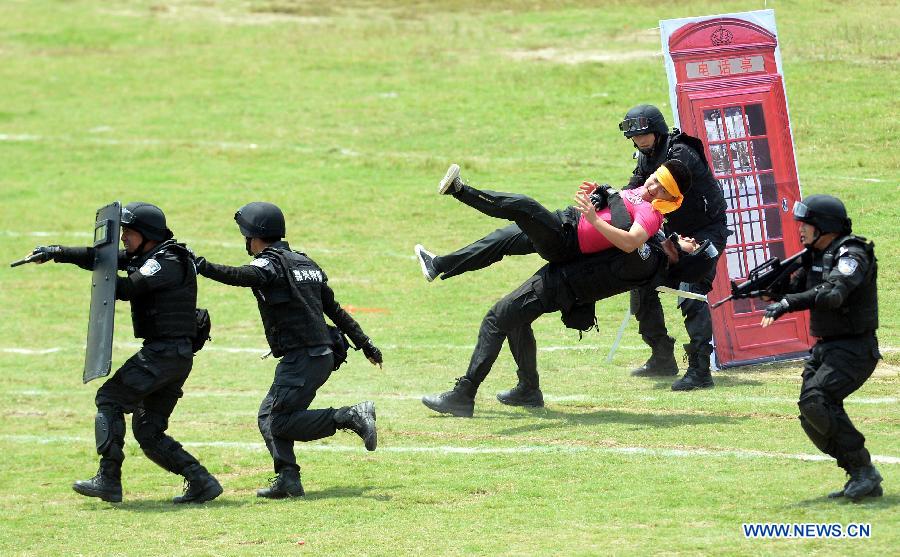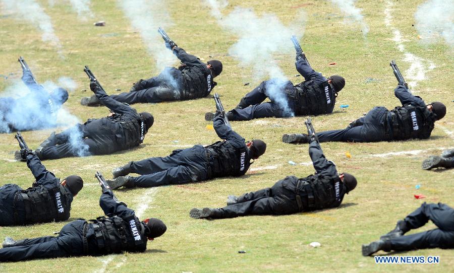 A sniper shows equipment at an anti-terrorism drill in Shaoxing, east China's Zhejiang Province, May 27, 2014. Police of Zhejiang Province held an anti-terror drill on Tuesday.(Xinhua/Wang Dingchang)