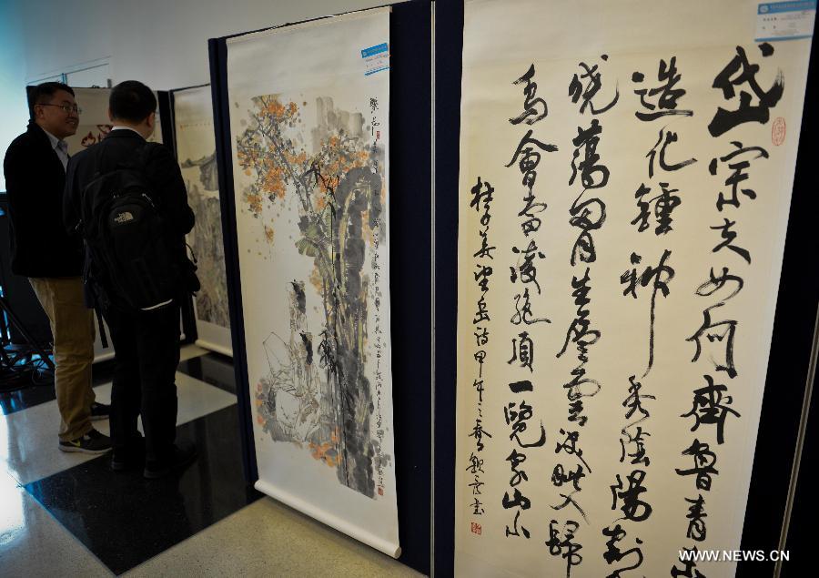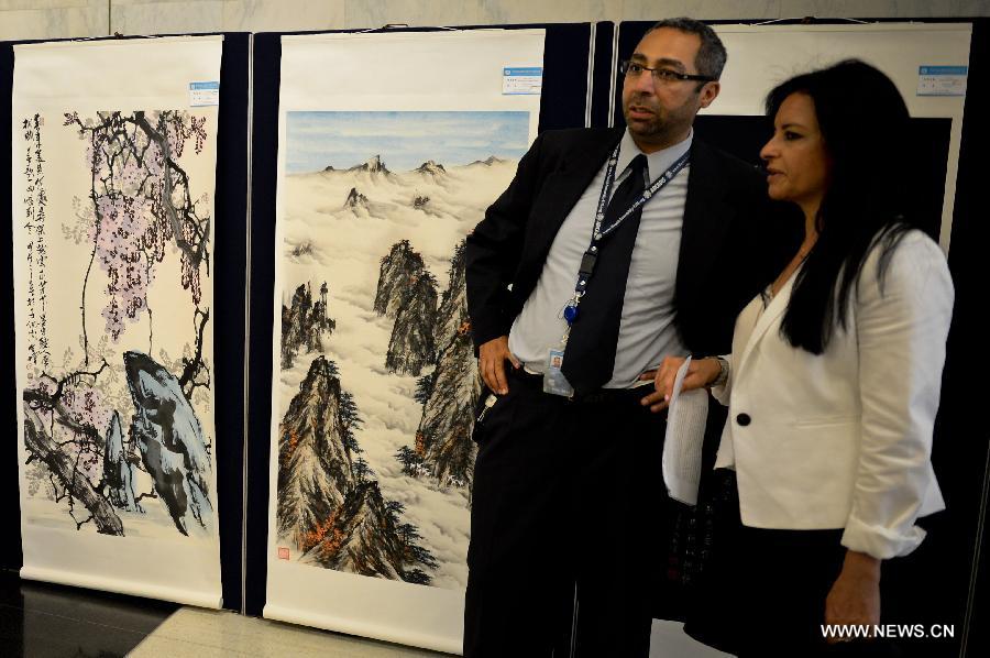 Visitors look at paintings on display during an exhibition of Chinese paintings and calligraphy works, at the United Nations headquarters in New York, on May 27, 2014. Dozens of Chinese paintings and calligraphy works are on display at the exhibition unveiled here Tuesday. (Xinhua/Niu Xiaolei)