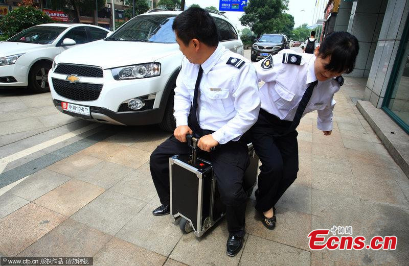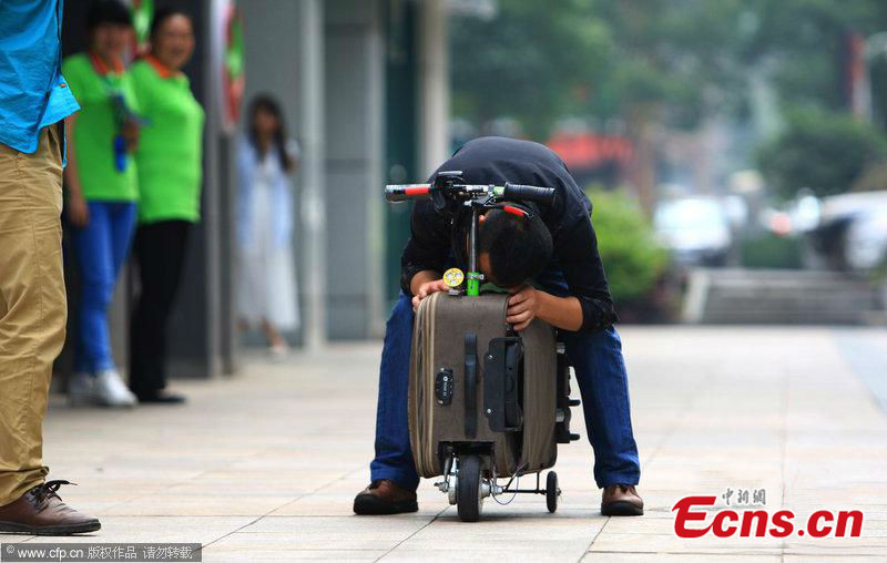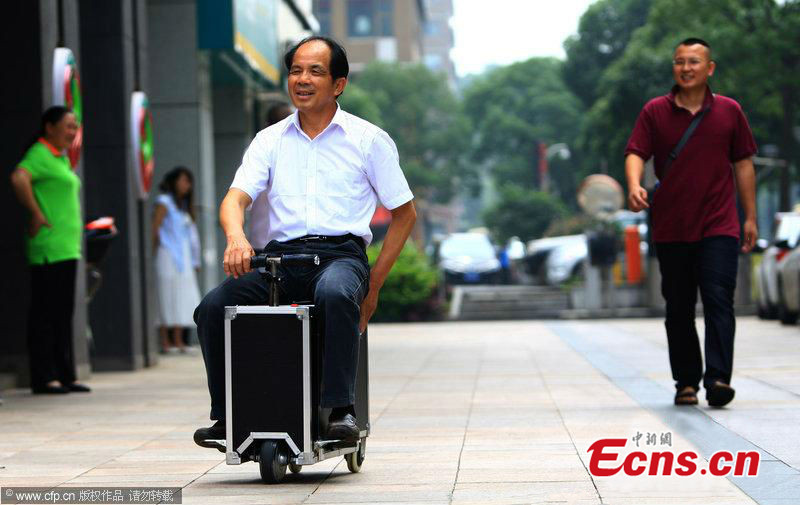 He Liangcai, a farmer from Changsha of central China's Hunan province, displays his invention "manned luggage" on May 28, 2014. He spent over ten years on the "manned luggage", which can carry one to two persons and run 50-60 kilometers after a charging. Its highest speed can reach 20 kilometers per hour. The new product has successfully applied for national patents. [Photo/CFP]