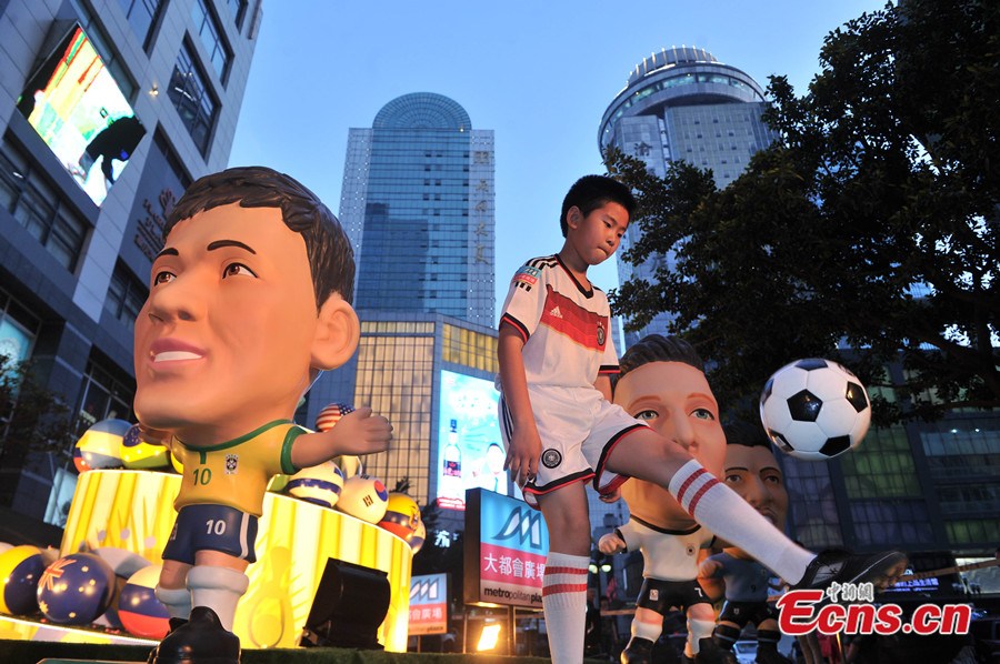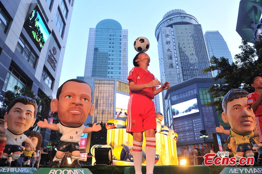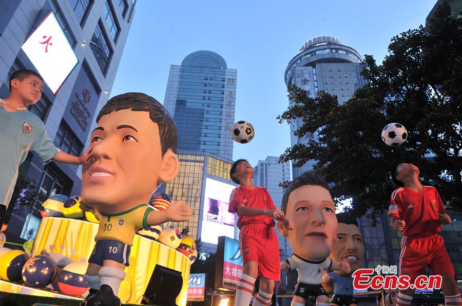 Twelve large puppets of football stars are erected for the upcoming World Cup in downtown Chongqing on May 28, 2014. The 2014 FIFA World Cup, an international men's football tournament, is scheduled to take place in Brazil from June 12 to July 13. [Photo/ Chen Chao]