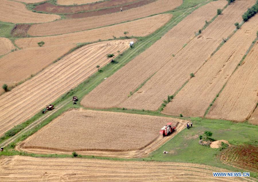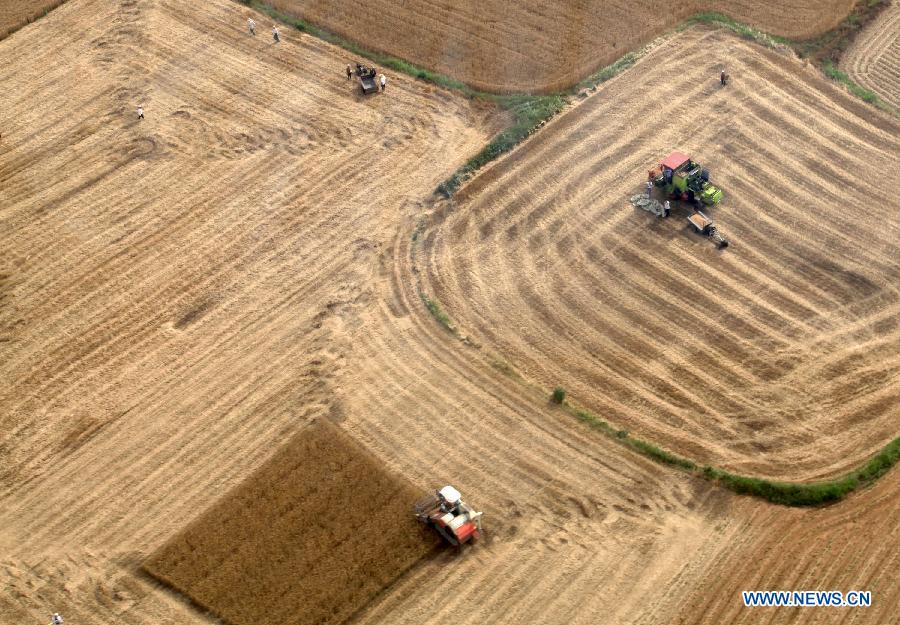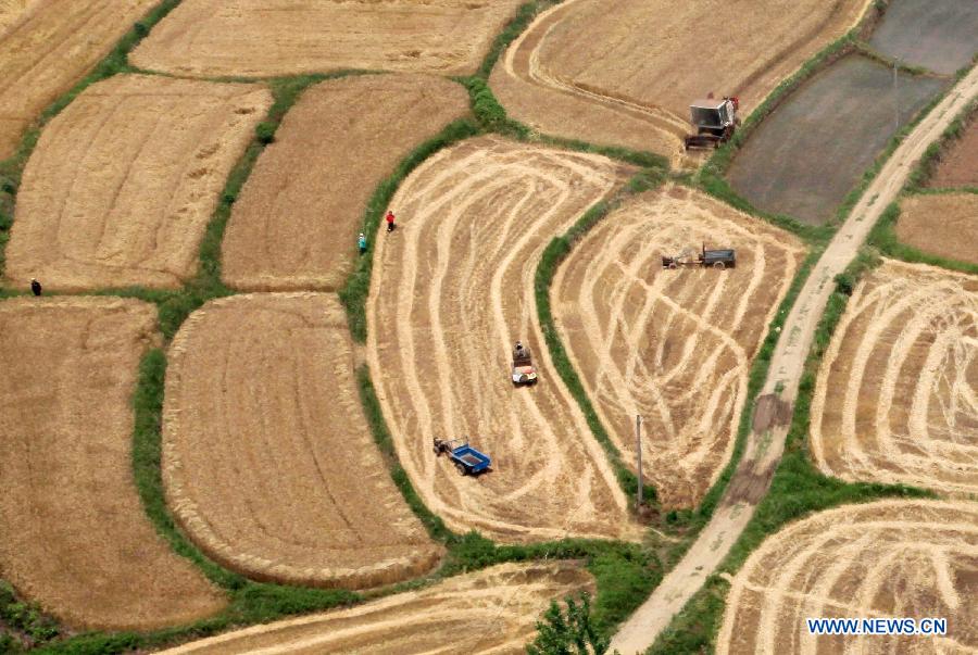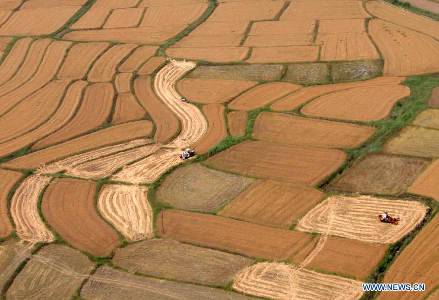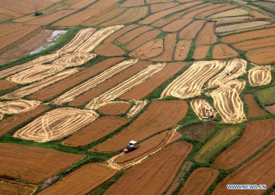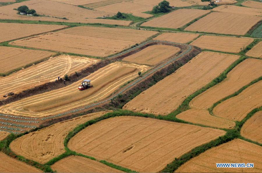 Photo taken on May 29, 2014 shows an overlook of wheat harvest in Xuyi County of Huai'an, east China's Jiangsu province. (Xinhua/Zhou Haijun)