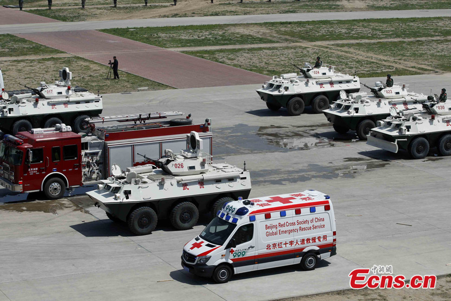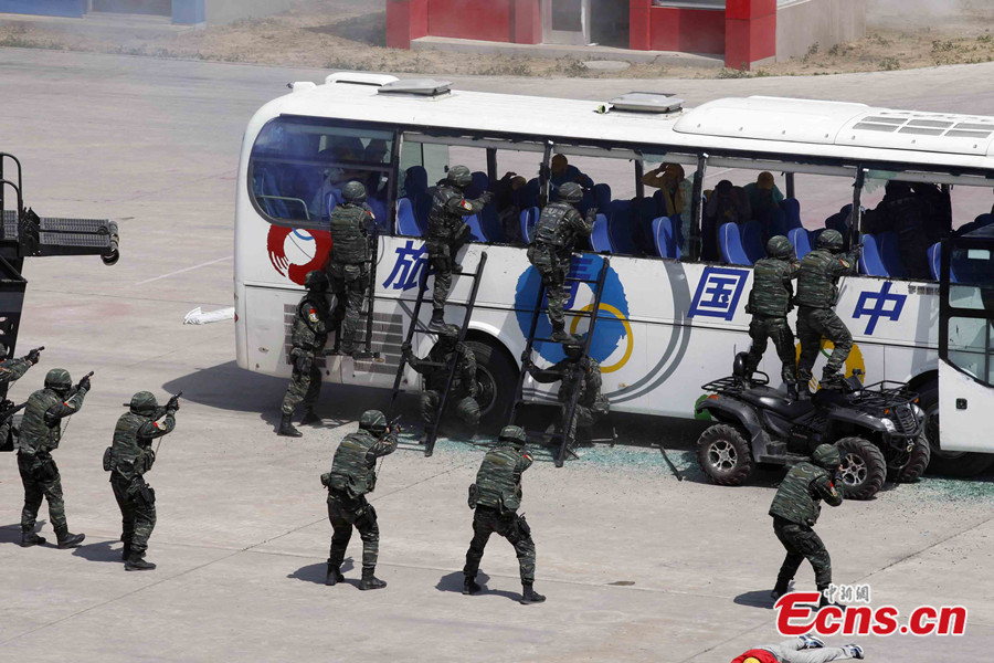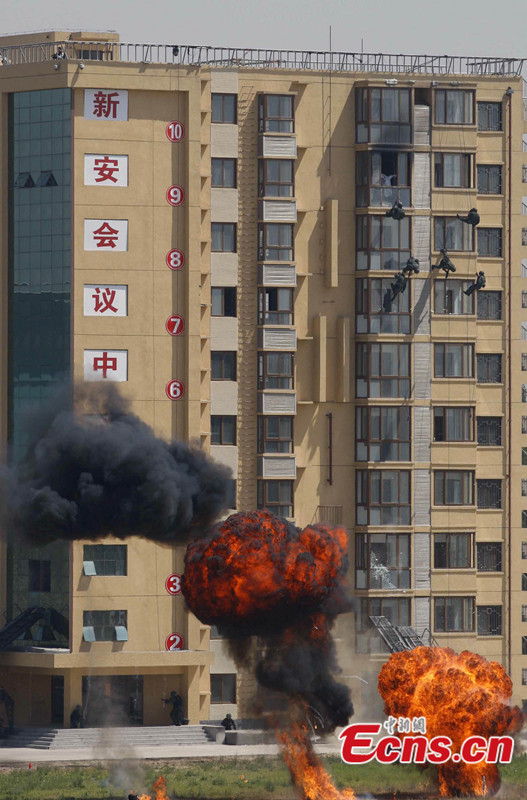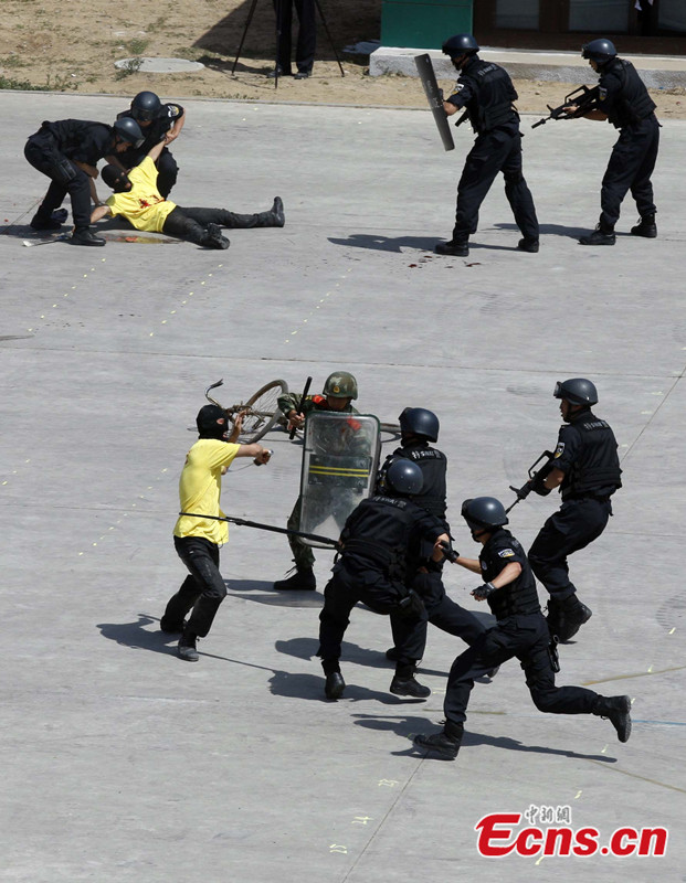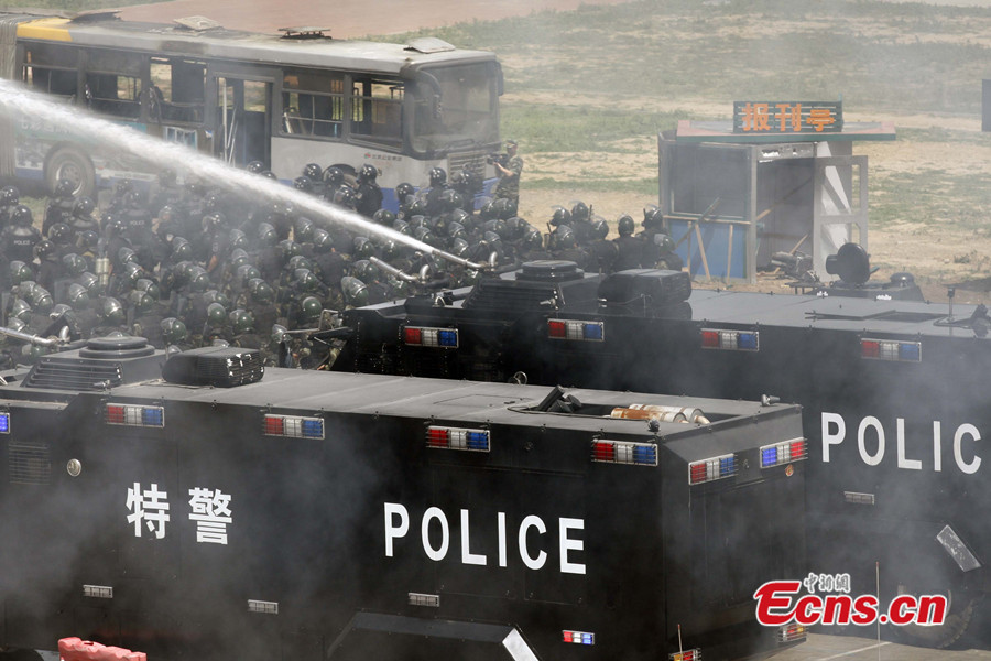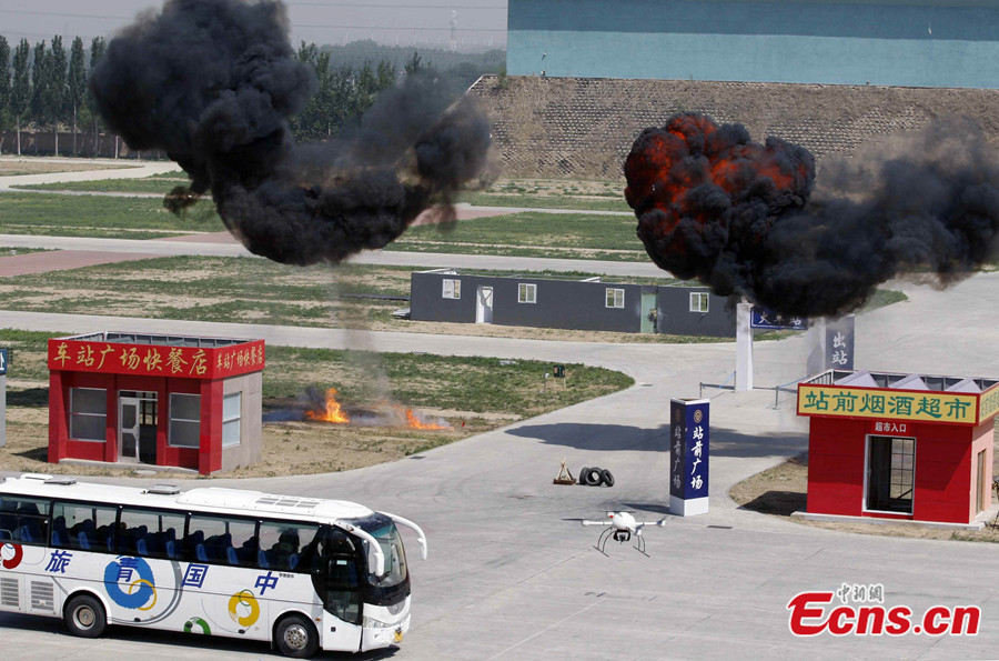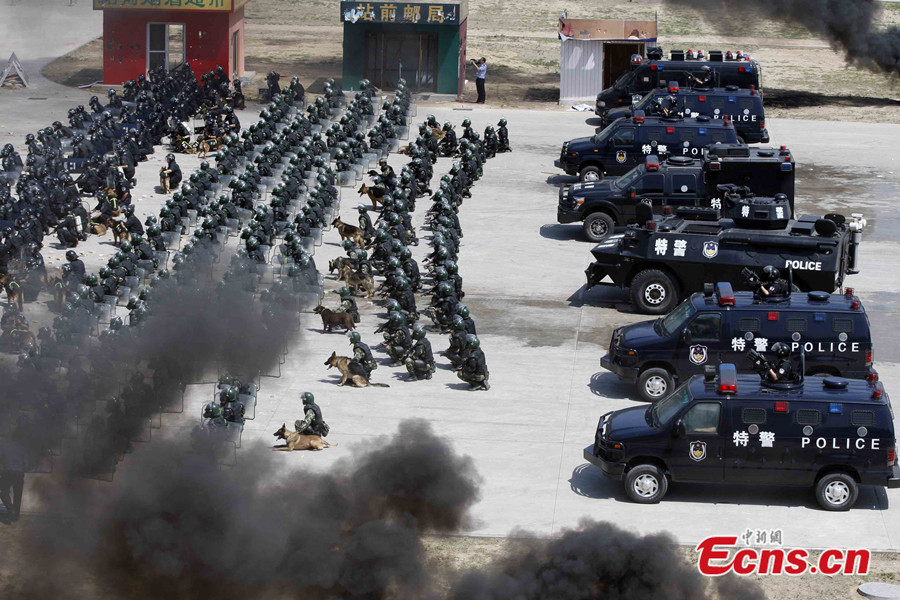 More than 2,800 police officers took part in a large-scale anti-terrorist and anti-riot drill held in Beijing, capital of China, May 29 2014. The drill, jointly launched by the municipal anti-terrorism office, public security bureau, Armed Police Corps and fire department, is the largest of its kind this year. The drill included exercises in coping with hijackings, knife-wielding attackers and terrorism-related riots. Police helicopters, drones and high-rise firefighting equipment were deployed in the drill. [Photo: China News Service / Ren Haixia]