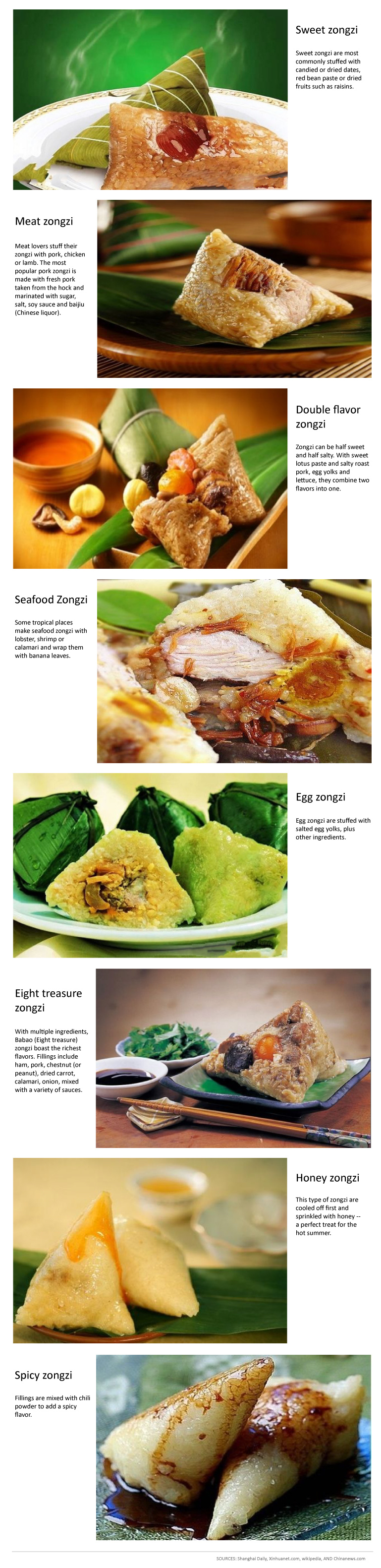 Zongzi vary in shapes, fillings and wraps. Check out the photo gallery for eight savory styles.