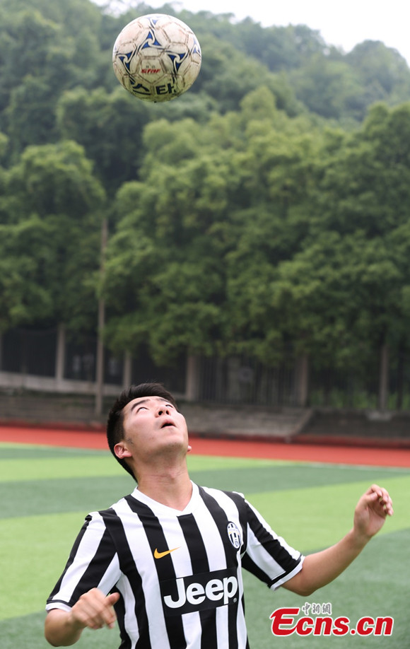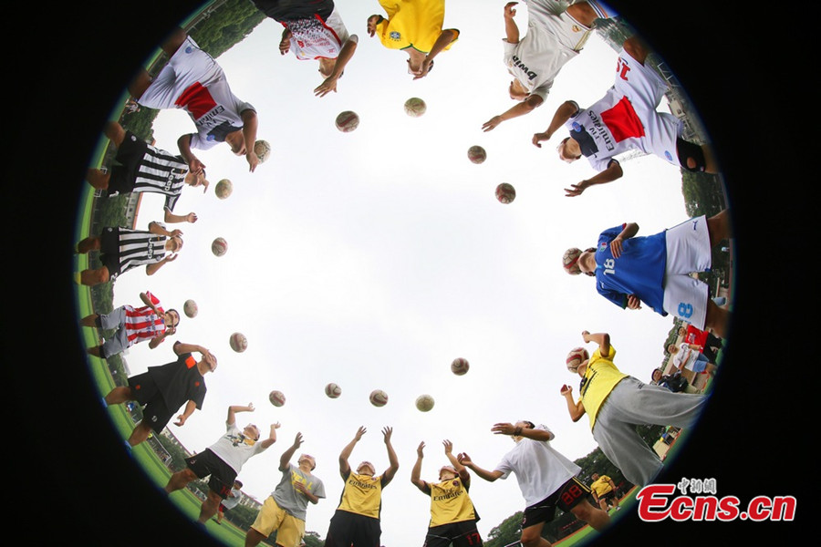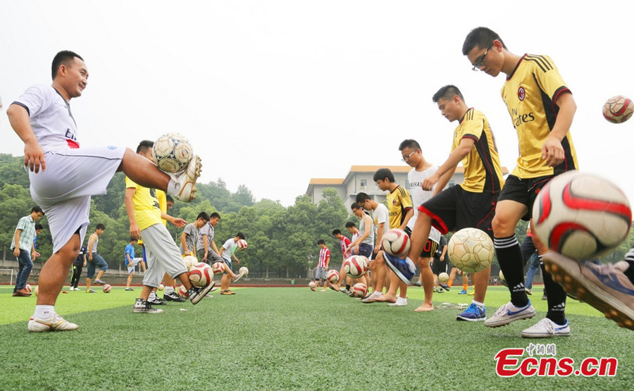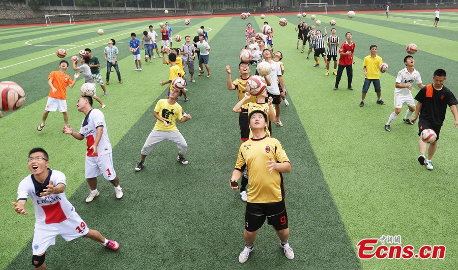 Students participate in a football juggling competition to mark the upcoming FIFA World Cup at University of South China in Hengyang of central China's Hunan province on June 3, 2014. [Photo: China News Service / Cao Zhengping]
