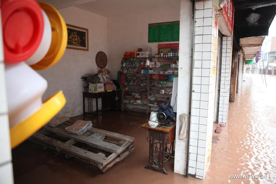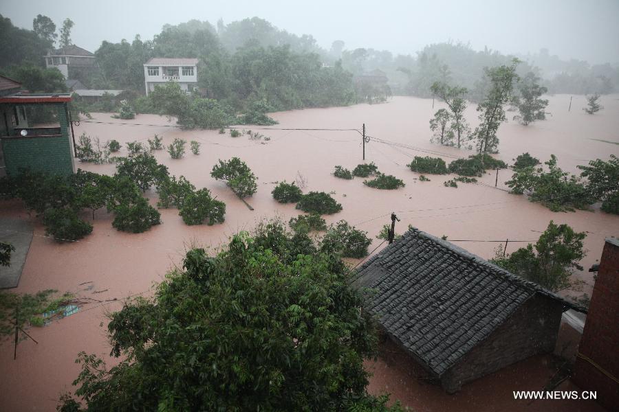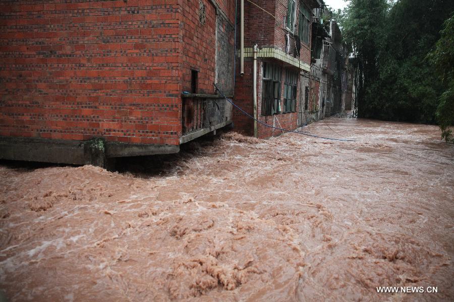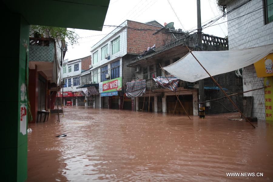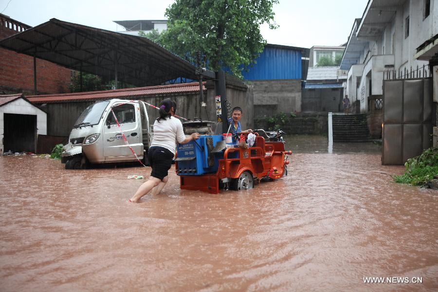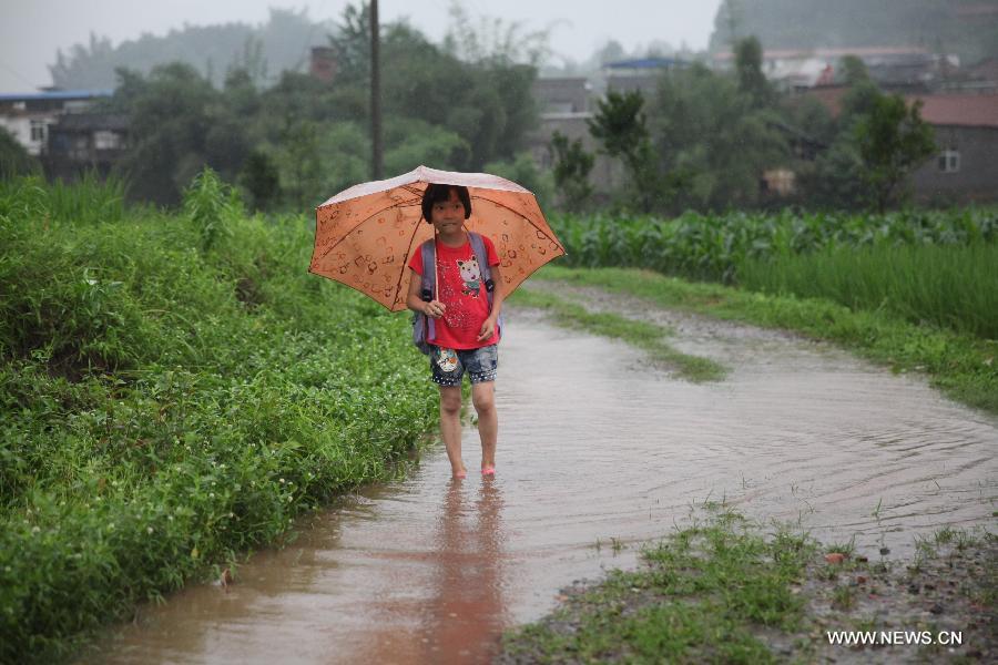A girl walks along a flooded path in Simianshan Town of Jiang'an County, southwest China's Sichuan Province, June 3, 2014. Heavy rainstorms hit the town Monday evening, flooding streets and causing traffic interruptions. (Xinhua/Zhuang Ge'er)