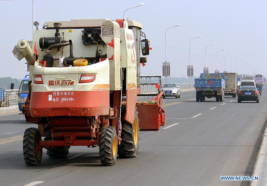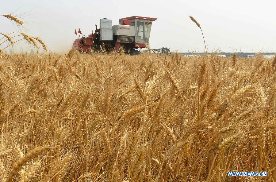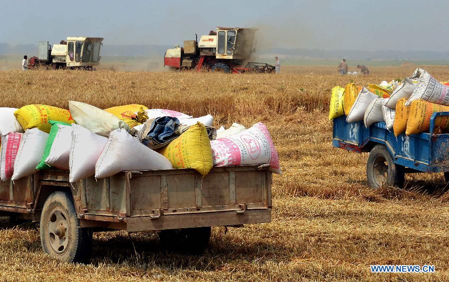 Two trucks are loaded with harvested wheat in Yangzhuang Village under Yuanyang County, central China's Henan Province, June 3, 2014. Harvest work is in progress amid wheat fields in Henan, a major producing area of the crop. (Xinhua/Wang Song)