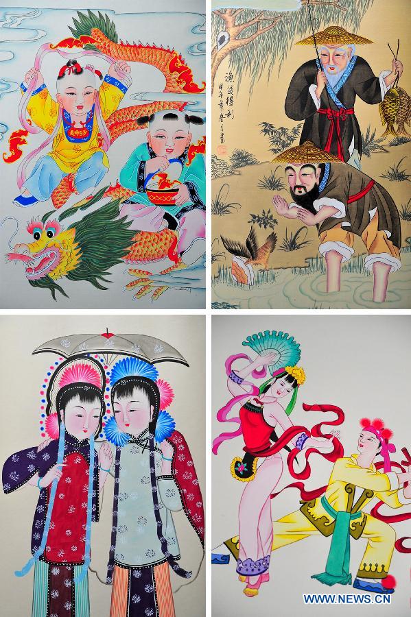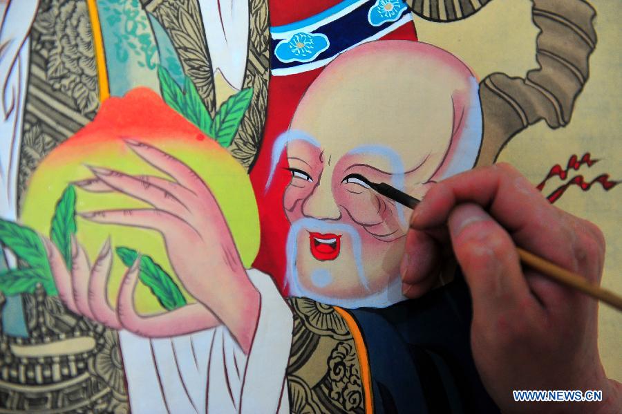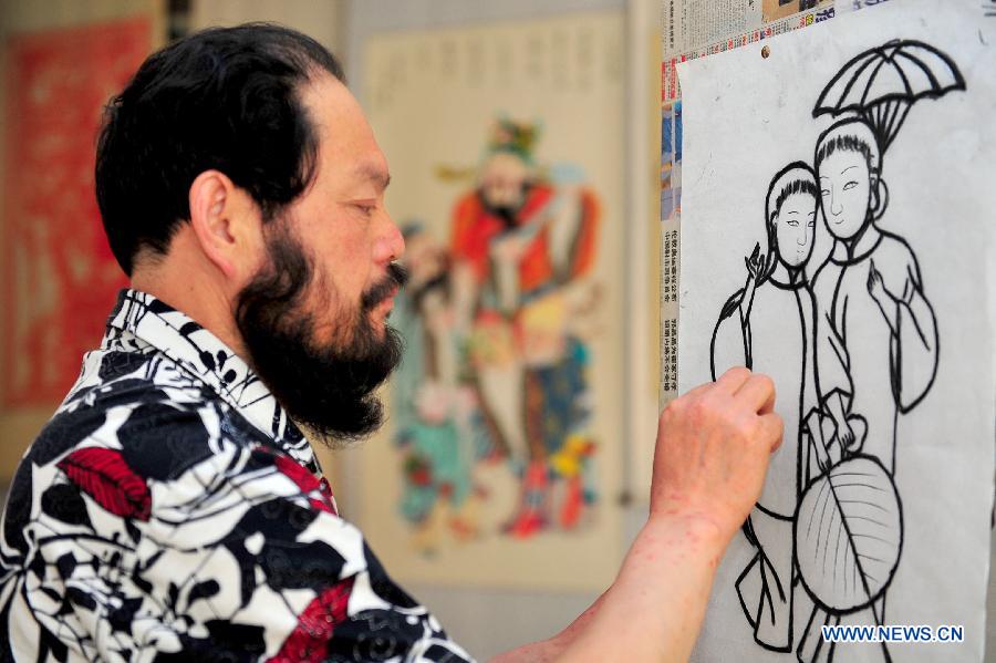 Shi Jianting, the sixth generation successor of Gaomi ash-patting new year painting, works on a painting at a studio in Gaomi, east China's Shandong Province, June 1, 2014. Gaomi ash-patting new year painting is a traditional art craft which has enjoyed a history of over 500 years and only existed in Gaomi. It has been included in the list of national intangible cultural heritages. (Xinhua/Guo Xulei)