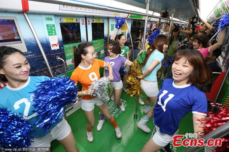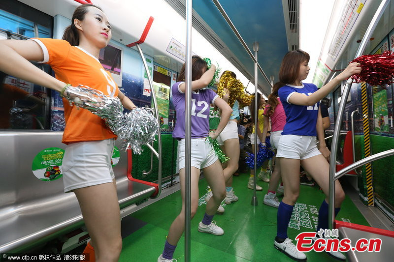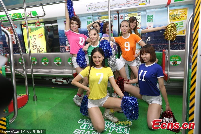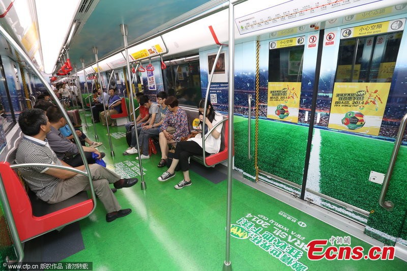 The Subway Line 1 in Hangzhou of Zhejiang province opens a special train, which features FIFA World Cup style, on June 5, 2014. Passengers can meet with football babies on the train and at subway stations during the upcoming international sports event. [Photo/CFP]