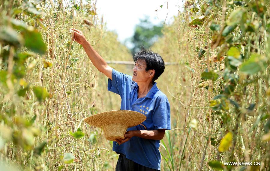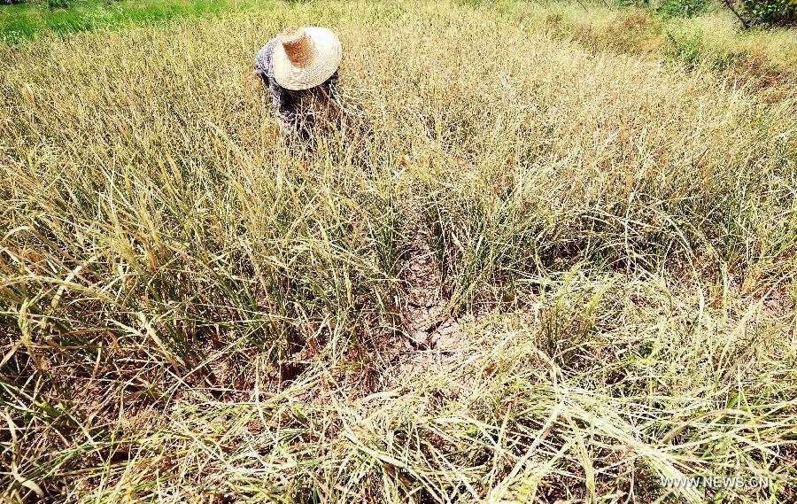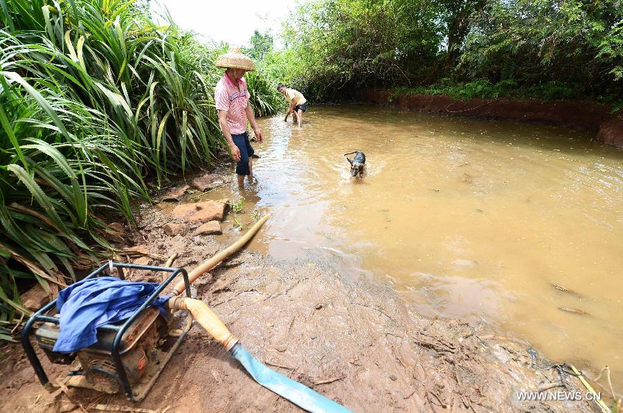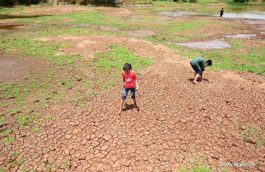 Children play games at a dry fishpond of Shiguoxia Village in Xuwen County, south China's Guangdong Province, June 5, 2014. Affected by the continuous drought, the total rainfall in the first five months of 2014 in Xuwen County is only 154.8mm, decreasing 40 percents year-on-year, according to the local meteorological department. (Xinhua/Lu Hanxin)