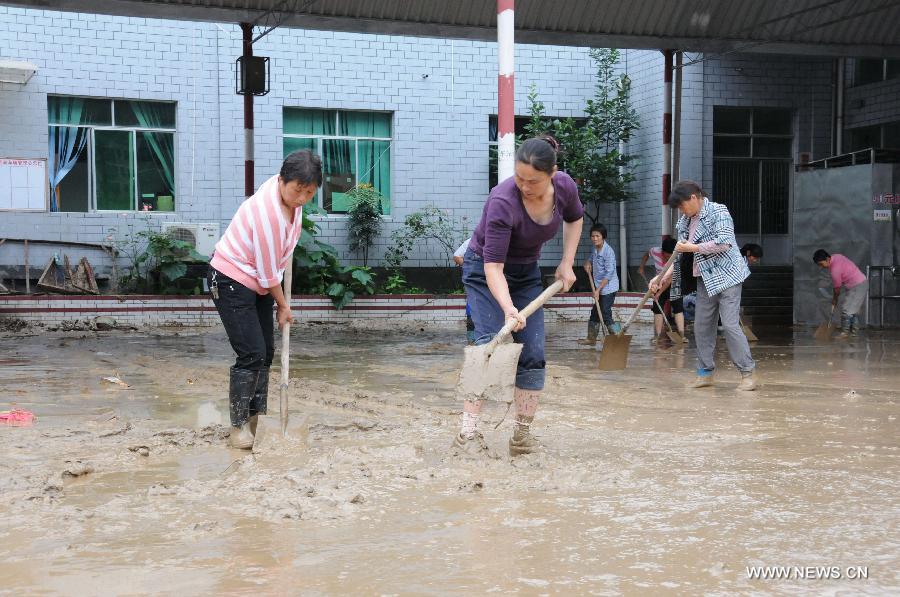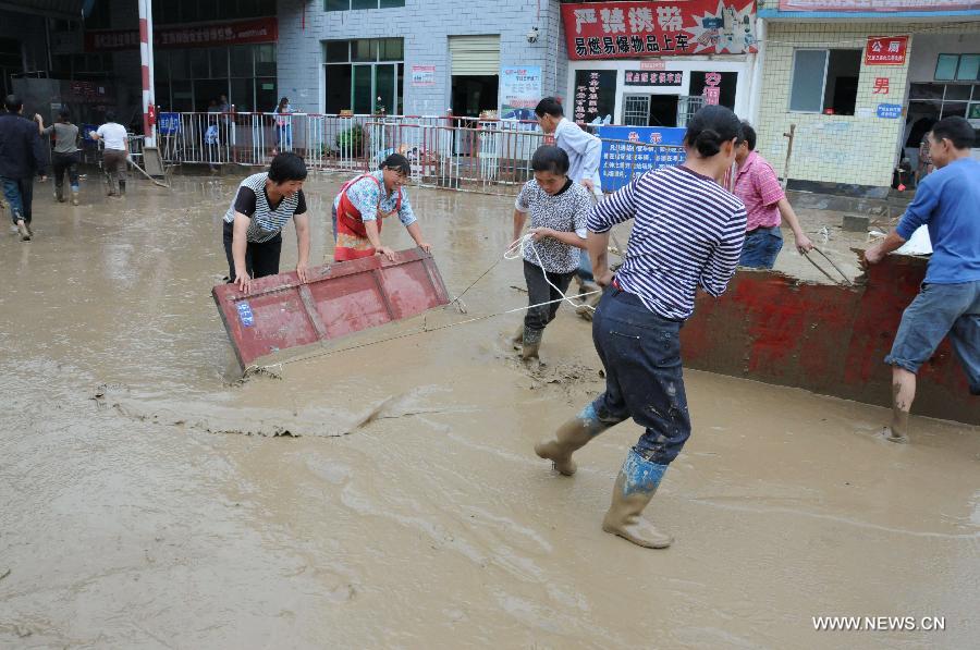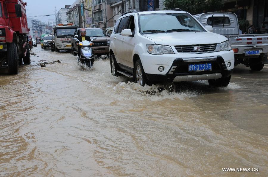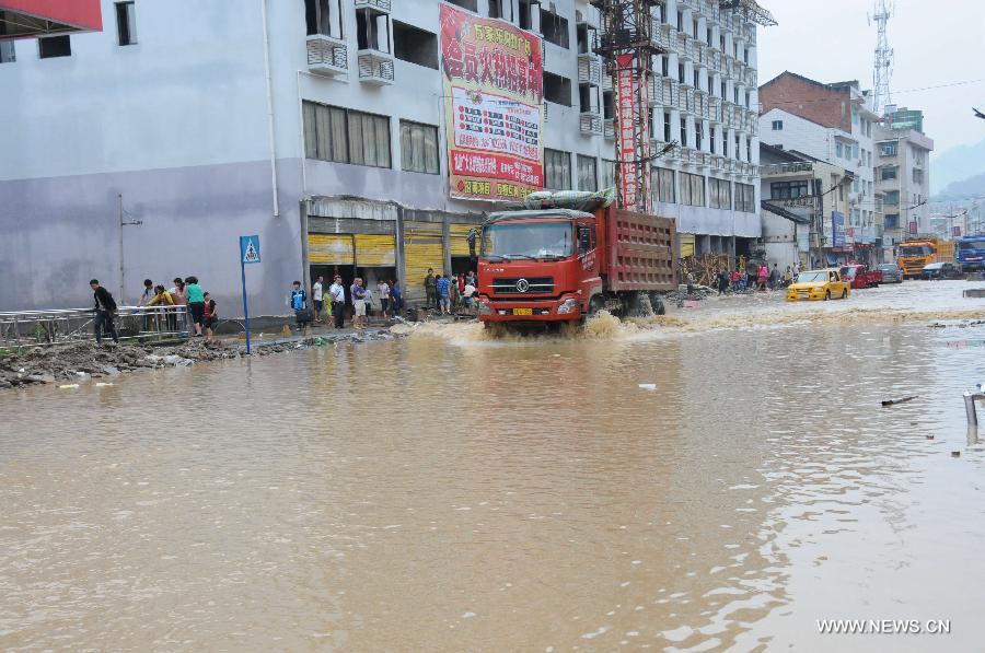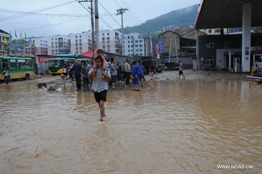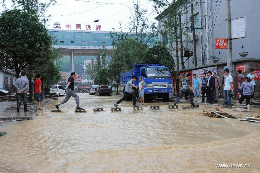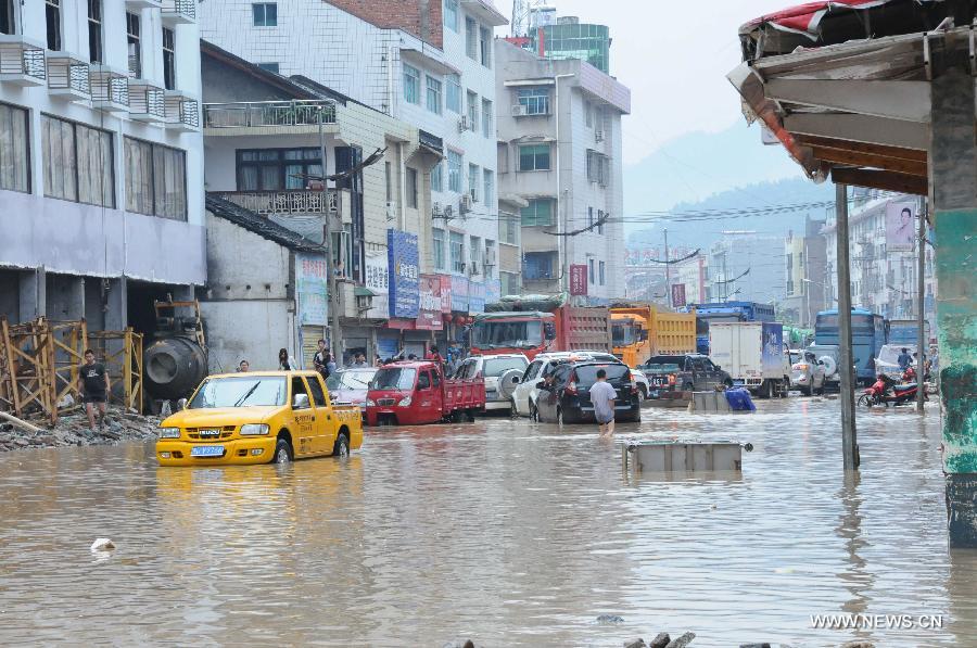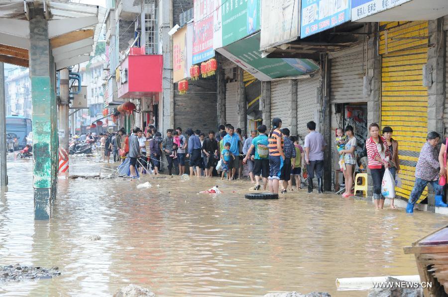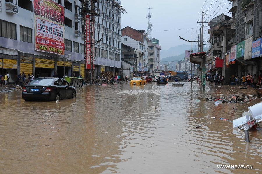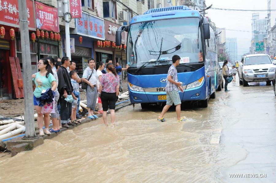 Passengers wait by a flooded street outside the Shiqian bus station in Shiqian County, southwest China's Guizhou Province, June 5, 2014. Six people were reported dead and another missing after torrential rains hit the county on Tuesday and Wednesday. Power, water and communications were cut off. (Xinhua/Li Qianyu)