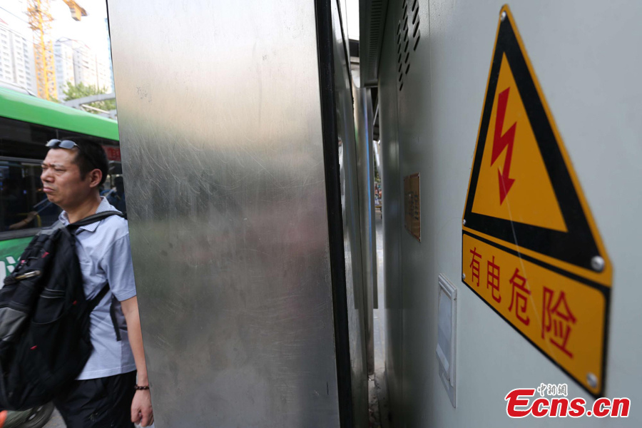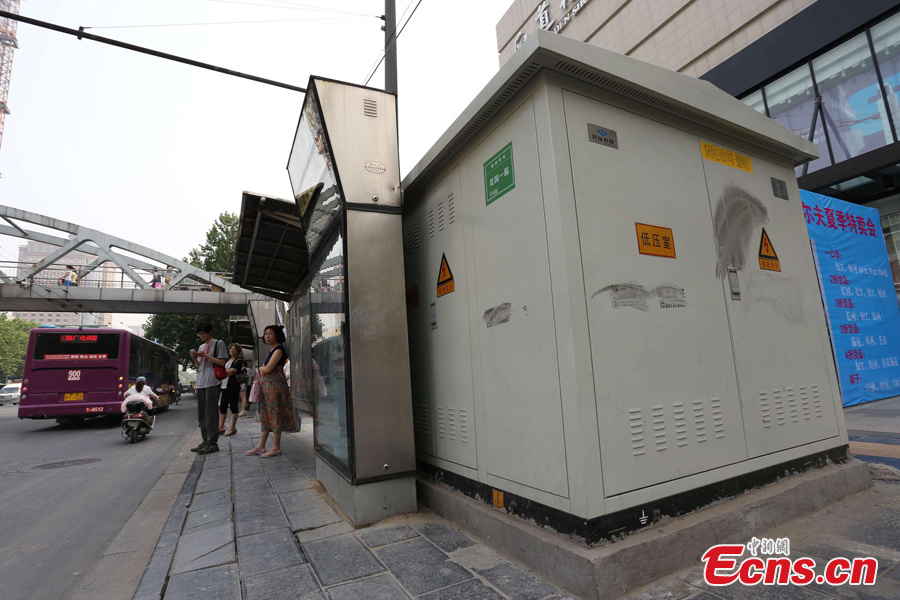 A woman tries to read a bus stop information board which stands close up to electrical equipment in Zhengzhou, Central China's Henan Province, on Friday, June 6, 2014. (Photo: China News Service/Yang Zhenghua)