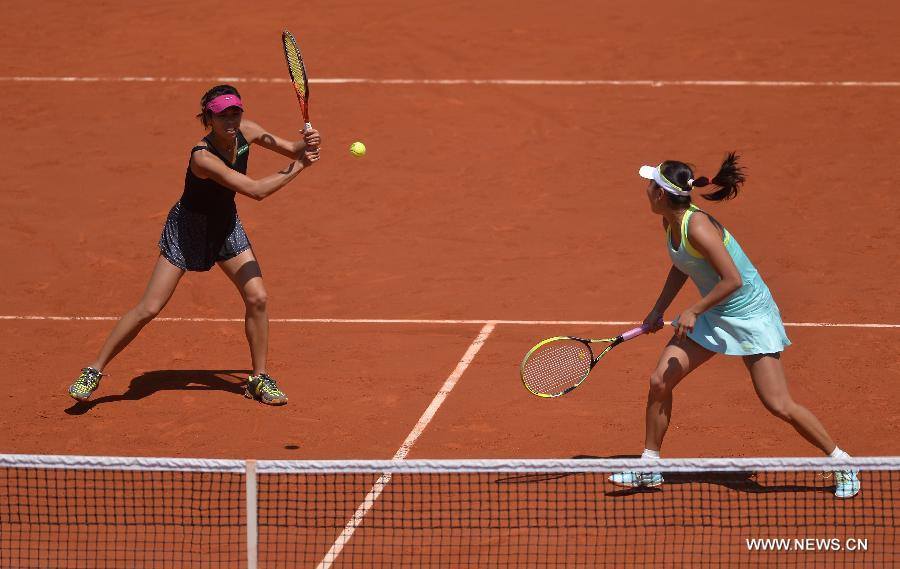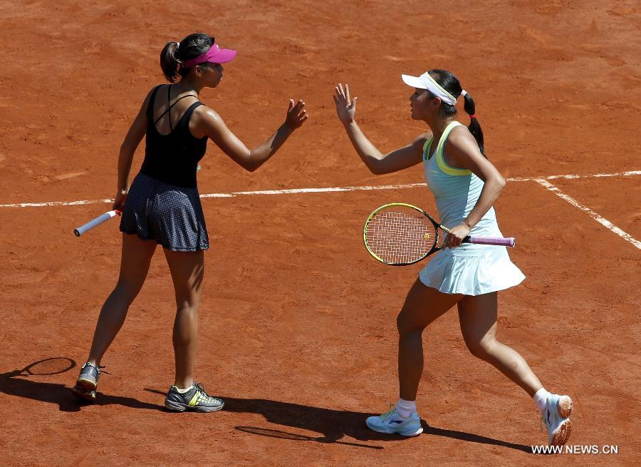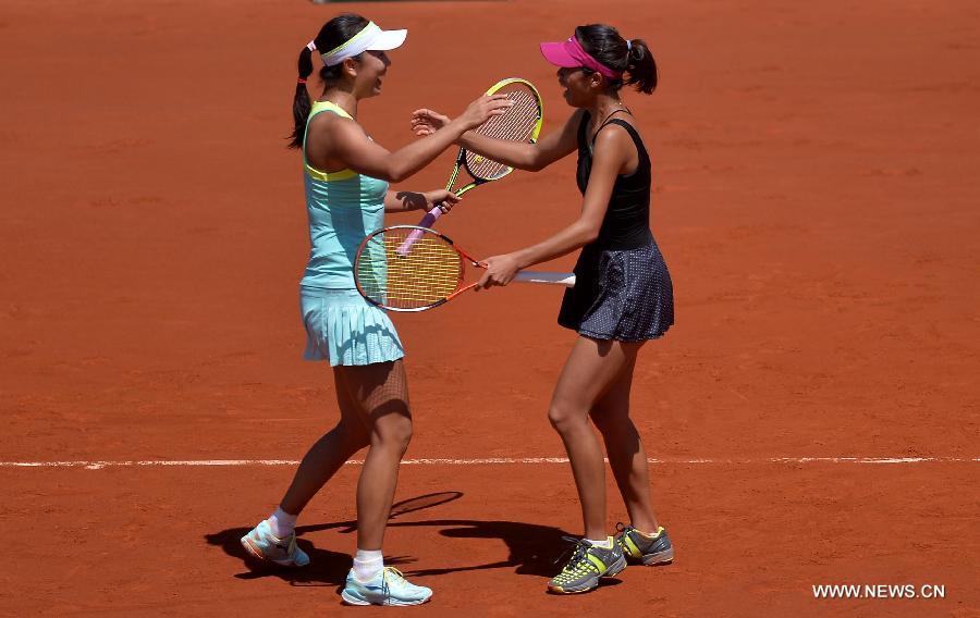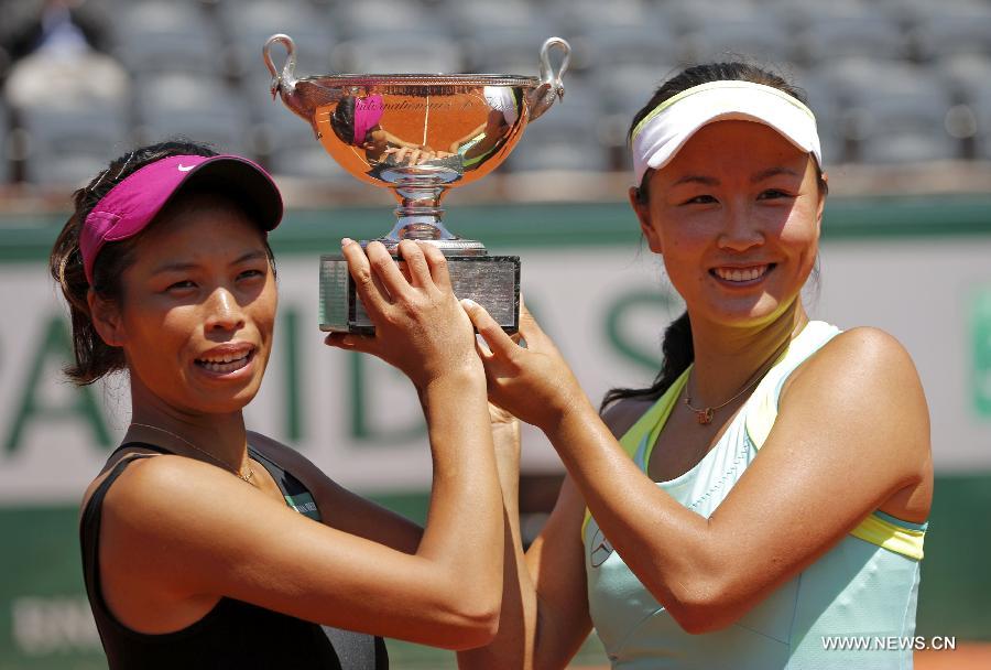 Top-seeded Peng Shuai of China and Hsieh Su-wei of Taiwan won their second Grand Slam title together by defeating Sara Errani and Roberta Vinci of Italy 6-4, 6-1 in the final of the French Open women's doubles on Sunday. (Photo: Xinhua/Reuters)