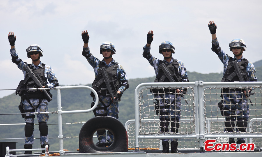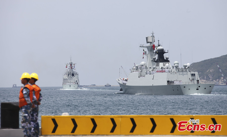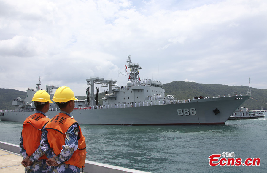 Chinese naval vessels, including the missile destroyer Haikou, the missile frigate Yueyang, the supplier ship Qiandaohu and the hospital ship Ark Peace, set sail from Sanya and Zhoushan ports to the United States around the noon on Monday to participate in the Rim of the Pacific (RIMPAC) multinational naval exercises. It is the first time that the Chinese navy participate in the joint maritime exercises organized by the US navy. [Photo/Yin Haiming]