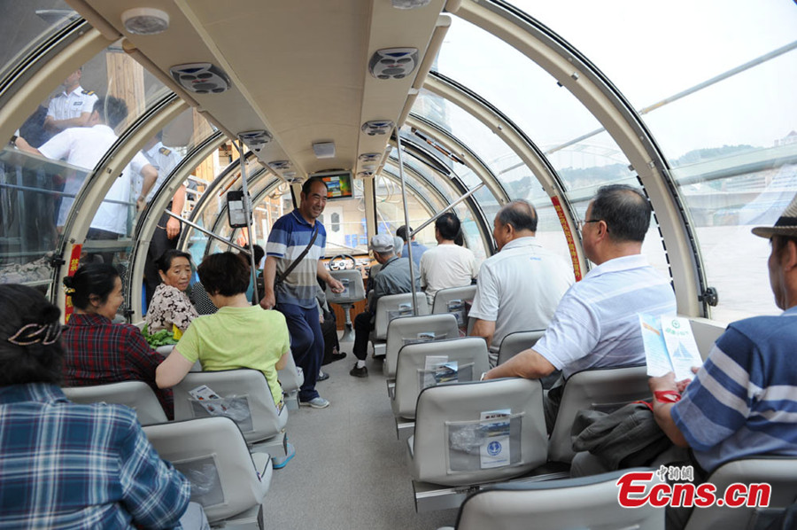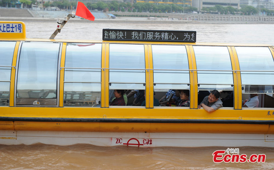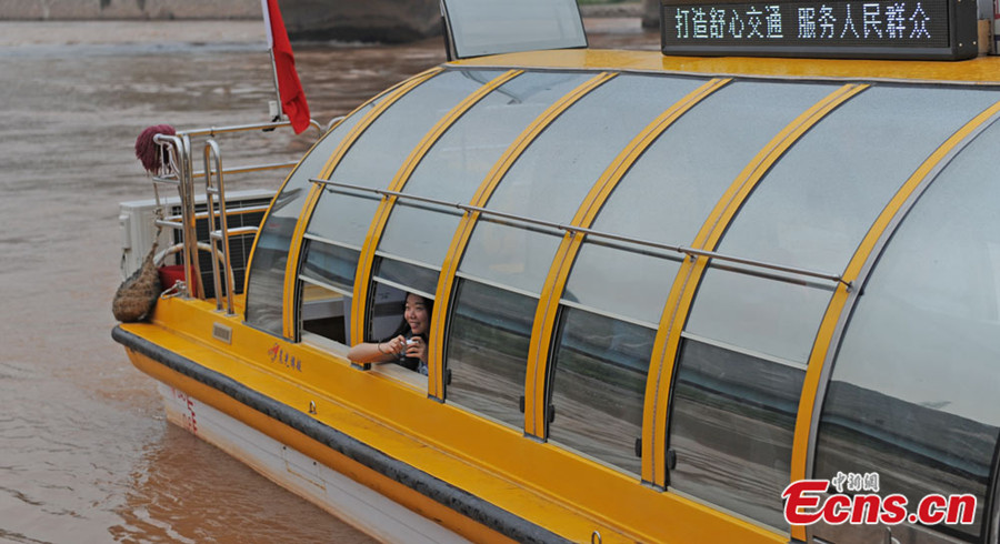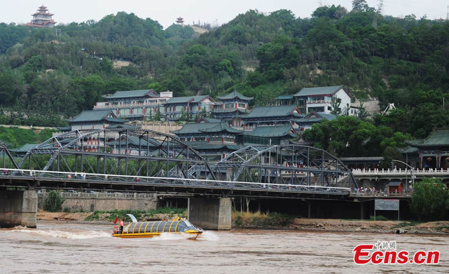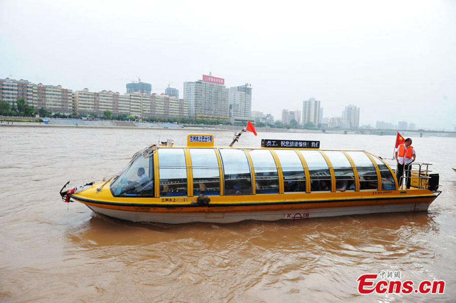 A water bus line begins trial operation on Yellow River in Lanzhou city of northwest China's Gansu province on June 10, 2014. The water bus runs at 7-9 a.m. and 5-7 p.m. every day from June 10 to September 10 during the trial operation with the ticket of 3 yuan per trip for one person. The water bus line covers 6.6 kilometers with five stops from Lanzhou Port to Shilidian Bridge North. A total of 8 boats with 32 seats each are put into operation. [Photo/Yang Yanmin]