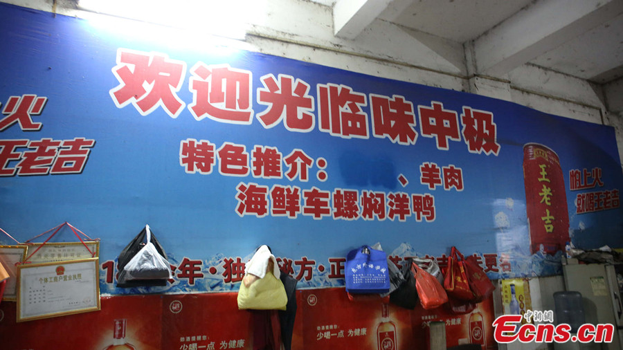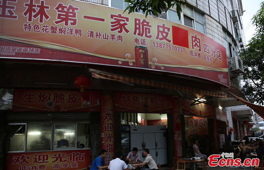 Photo taken on June 10, 2014 shows owner of a restaurant offering dog-meat dishes in Yulin, Guangxi covers the character "dog" on the shop sign to avoid offending animal rights activists who lambast a dog-meat festival which will kick off on June 21. The annual dog-meat festival, which falls on the summer solstice, involves eating dog meat hotpot and lychees and drinking strong liquor. It has been a local tradition in Yulin for decades and attracts thousands of diners every year. [Photo: Chinanews.com /Tang Yanjun]