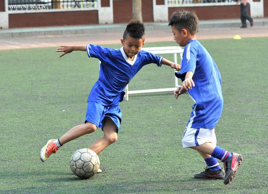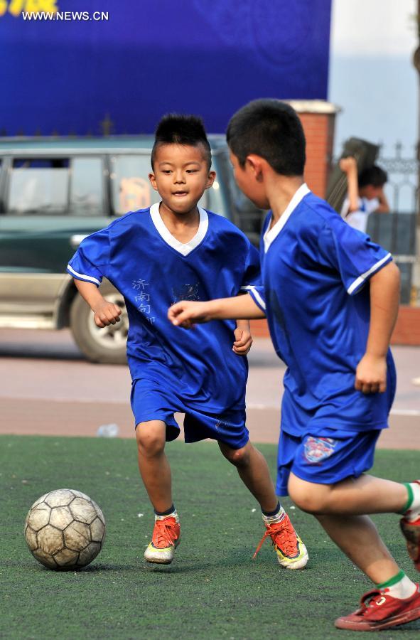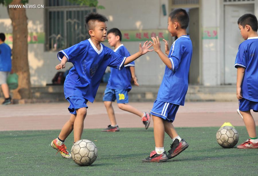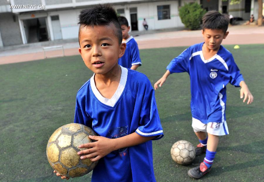 2014 FIFA World Cup ball boy Wang Yifan (front, 3rd R) of China poses with his school soccer teammates in the Dianliu No.1 Elementary School in Jinan, capital of east China's Shandong Province, June 10, 2014. Wang Yifan along with other 5 ball boys from China will serve the FIFA World Cup 2014 in Brazil. (Xinhua/Xu Suhui)