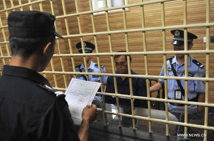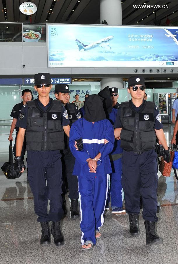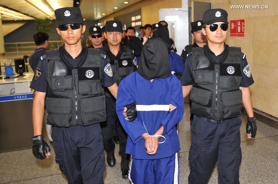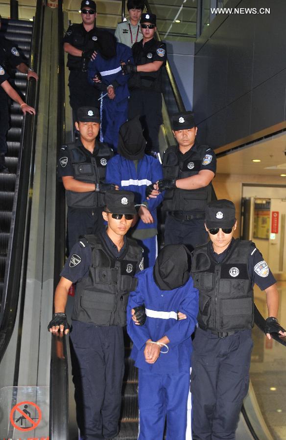 Suspected drug dealers are escorted by Chinese police to the provincial detention house after their arrival in Kunming, southwest China's Yunnan Province, June 10, 2014. Laotian police handed over five drug smuggling suspects to their Chinese counterparts at the Wat Tay Airport of Vientiane in Laos on Tuesday, who were arrested in the Mekong anti-drug campaign on March 19, 2013. (Xinhua/Lin Yiguang)
