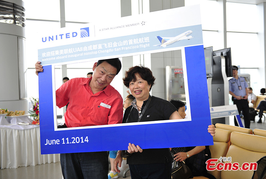 A Boeing 787 Dreamliner leaves Chengdu Shuangliu International Airport of Sichuan province for San Francisco on June 11, 2014. United Airlines has launched a direct air route between the two cities. The first flight of the route, carrying 208 passengers, arrived at Chengdu Shuangliu International Airport on Tuesday afternoon. [Photo: China News Service / An Yuan]